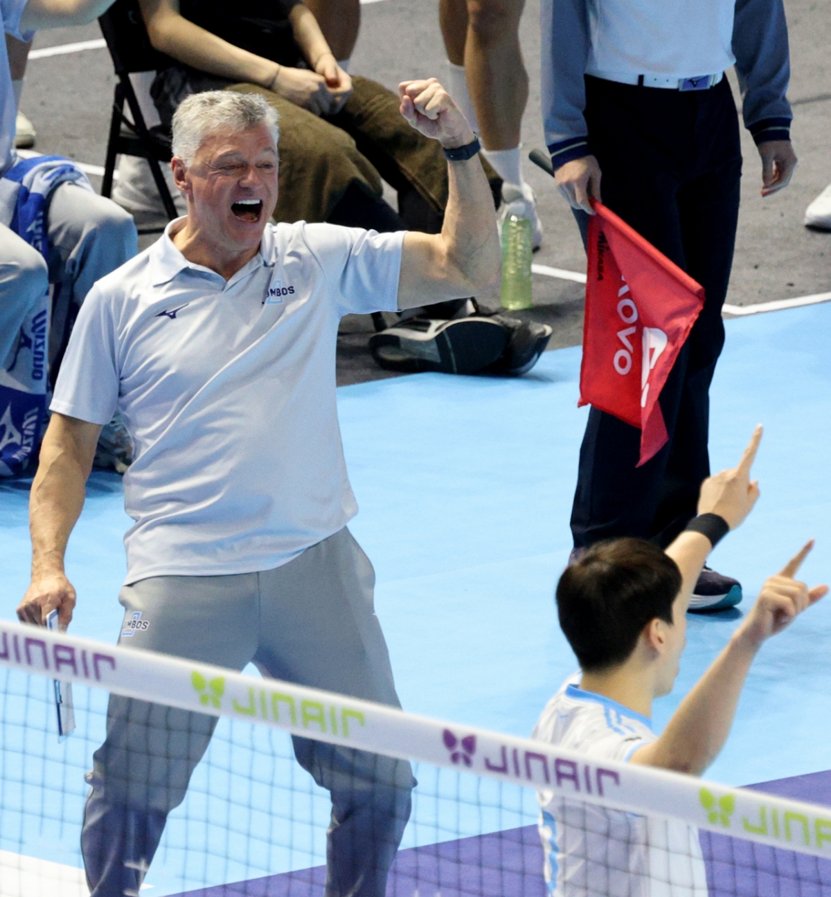 대한항공 헤난 감독이 2026년 2월 7일 계양체육관에서 열린 2025-2026 진에어 V리그 남자부 대한항공과 한국전력의 경기에서 득점에 환호하는 모습이 포착되었습니다.