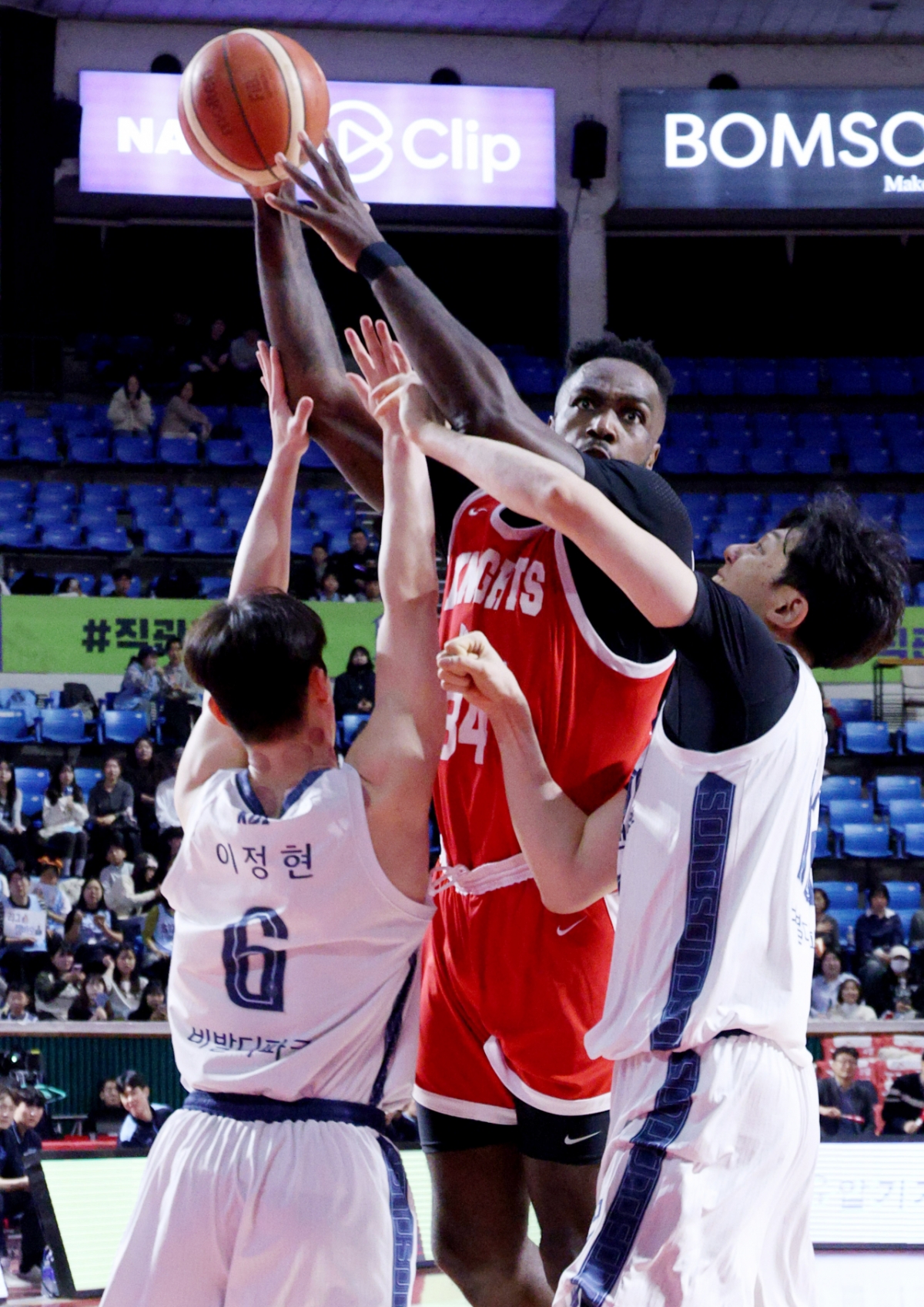 SK 자밀 워니가 소노 이정현과 강지훈을 제치고 골밑 패스를 시도하고 있다.