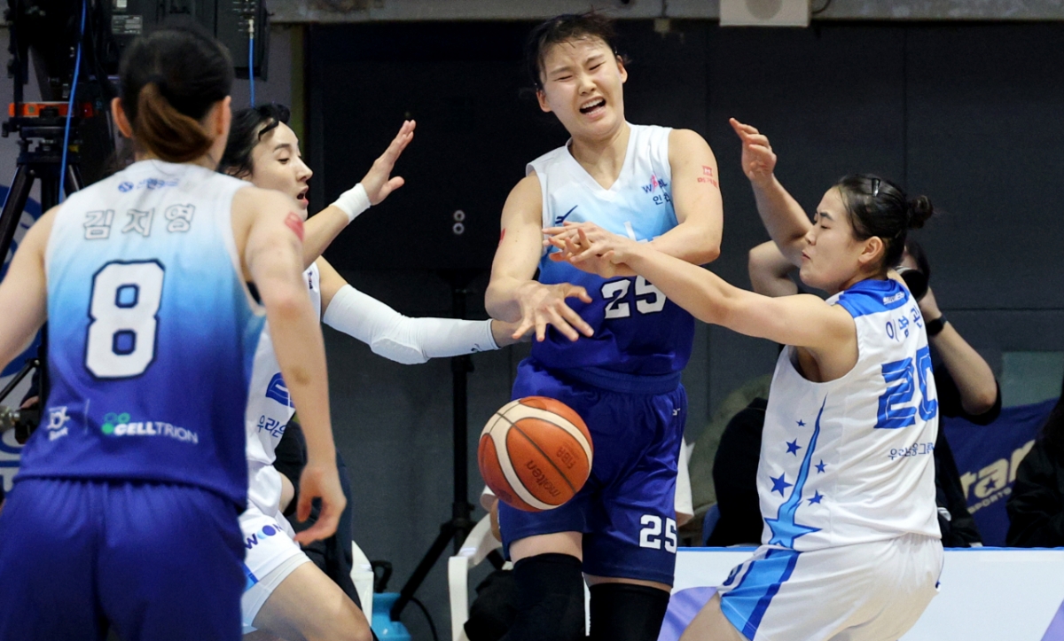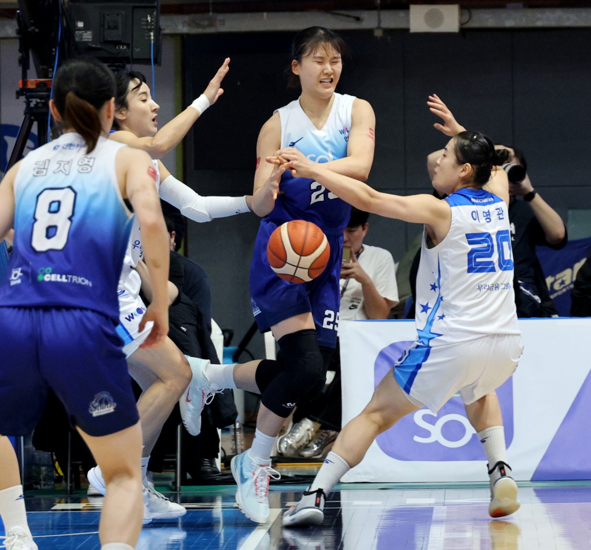 신한 홍유순이 2026년 2월 11일 인천 도원체육관에서 열린 2025-2026 WKBL 신한은행과 우리은행 경기에서 김단비와 이명관의 압박에 볼을 놓치는 장면이 포착되었습니다.