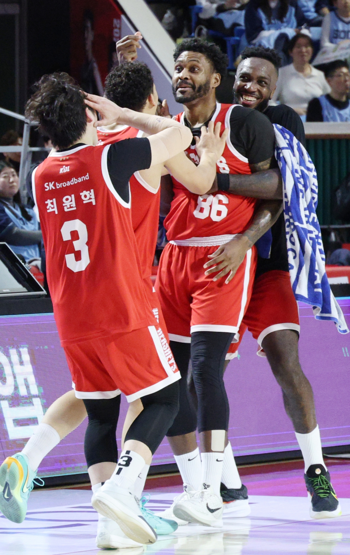 SK 대릴 먼로가 3쿼터 종료와 함께 먼로의 버저비터를 성공시킨 후 동료들의 축하를 받고 있다.