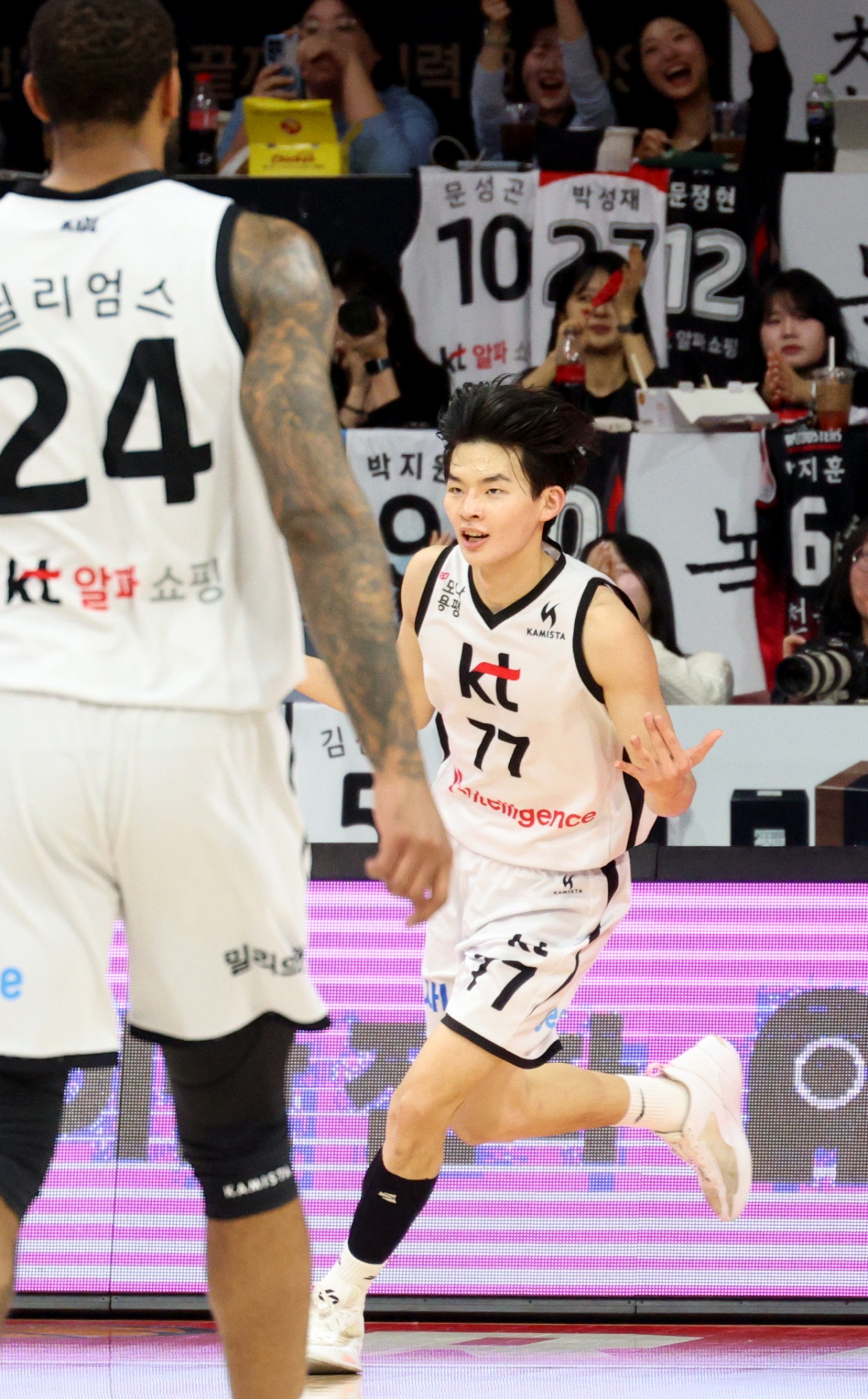 2025-2026 LG전자 프로농구 안양 정관장과 수원 KT의 경기가 13일 경기도 안양 정관장아레나에서 열렸으며, KT의 강성욱이 벼락 속공에 성공한 후 세리머니를 했습니다.
