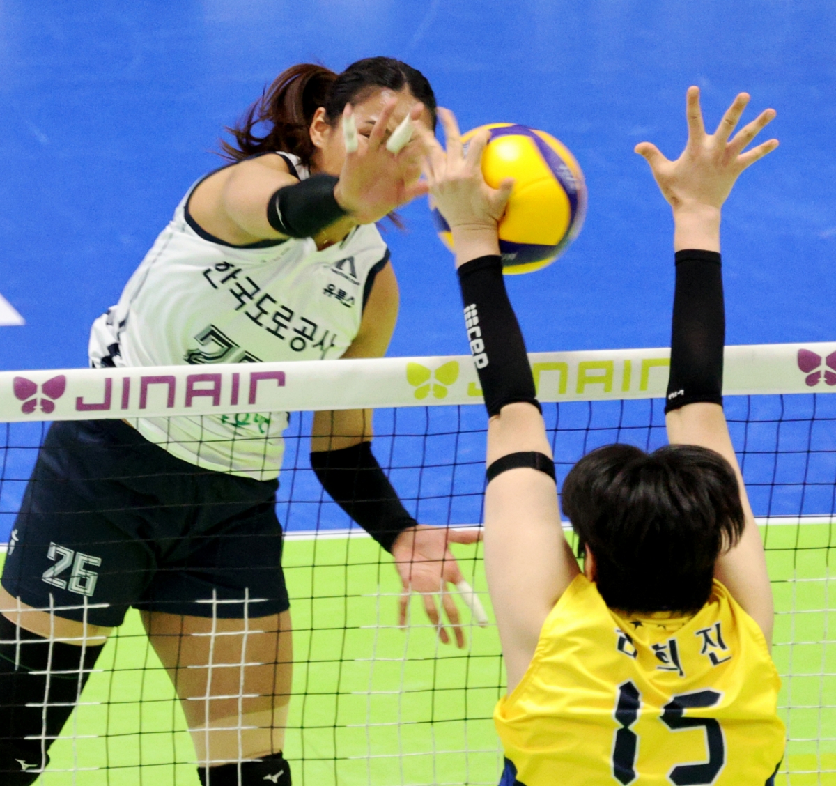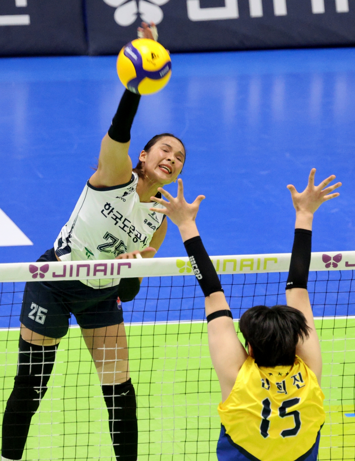 도로 타나차가 13일 수원체육관에서 열린 2025-2026 진에어 V리그 현대건설과 한국도로공사 경기에서 김희진의 블로킹에 강타를 터트리고 있다.