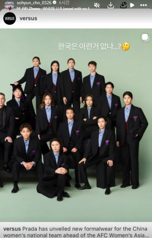 조소현은 17일 자신의 소셜 미디어에 중국 여자 대표팀이 프라다의 공식 의상을 지원받았다는 게시물을 공유했다.