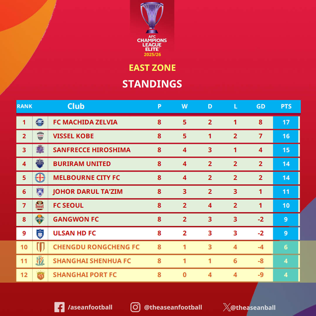 중국 프로축구 슈퍼리그 3개 팀은 18일 끝난 2025~2026 AFC 챔피언스리그 엘리트(ACLE) 동아시아 지역 리그 스테이지에서 최하위인 10~12위에 모두 자리했다.