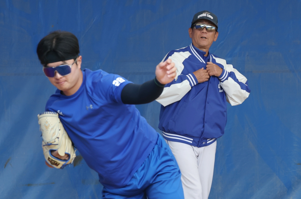 투수 이승민이 최일언 코치 지도하에 불펜 피칭을 하고 있다.