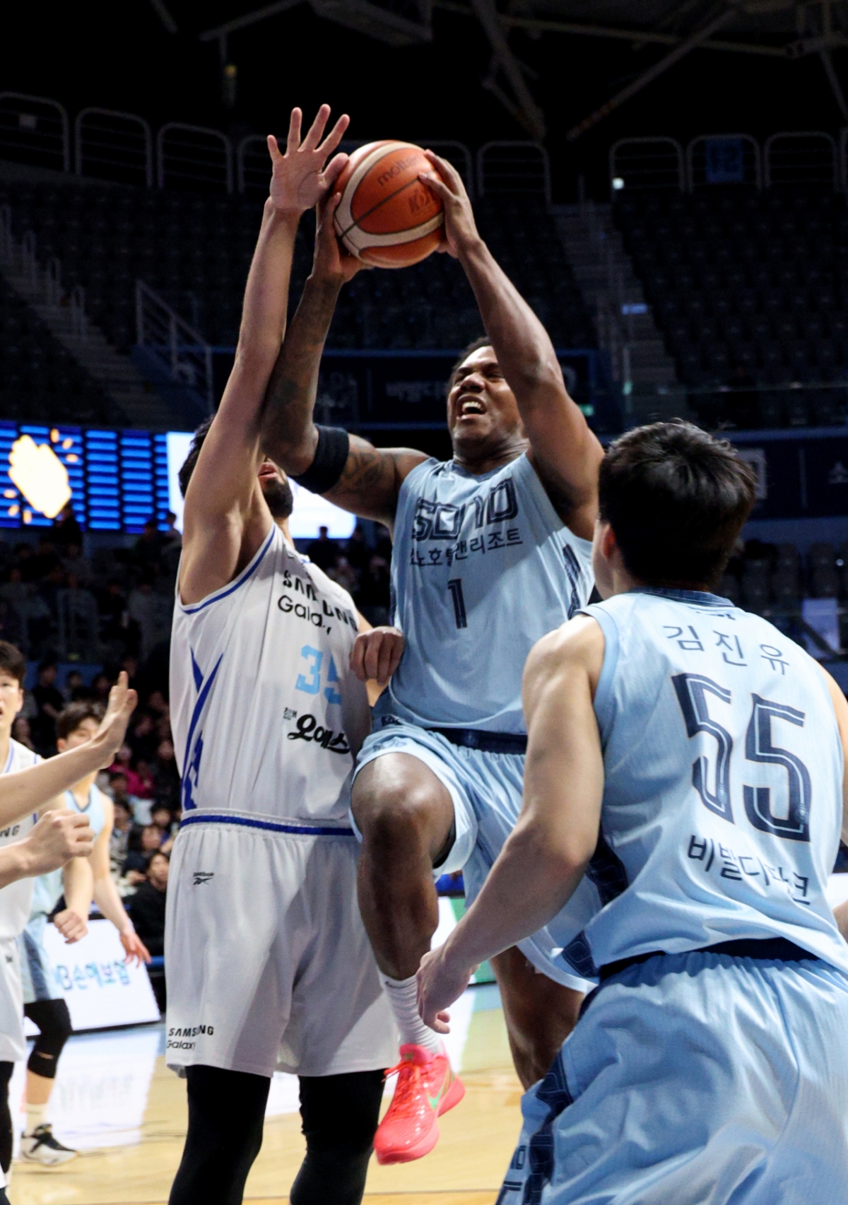 고양소노 나이트가 19일 고양소노아레나에서 열린 2025-2026 LG전자 프로농구 고양소노와 서울삼성의 경기에서 삼성 칸터의 마크를 받으며 레이업슛을 시도하고 있다. 2026.02.19.