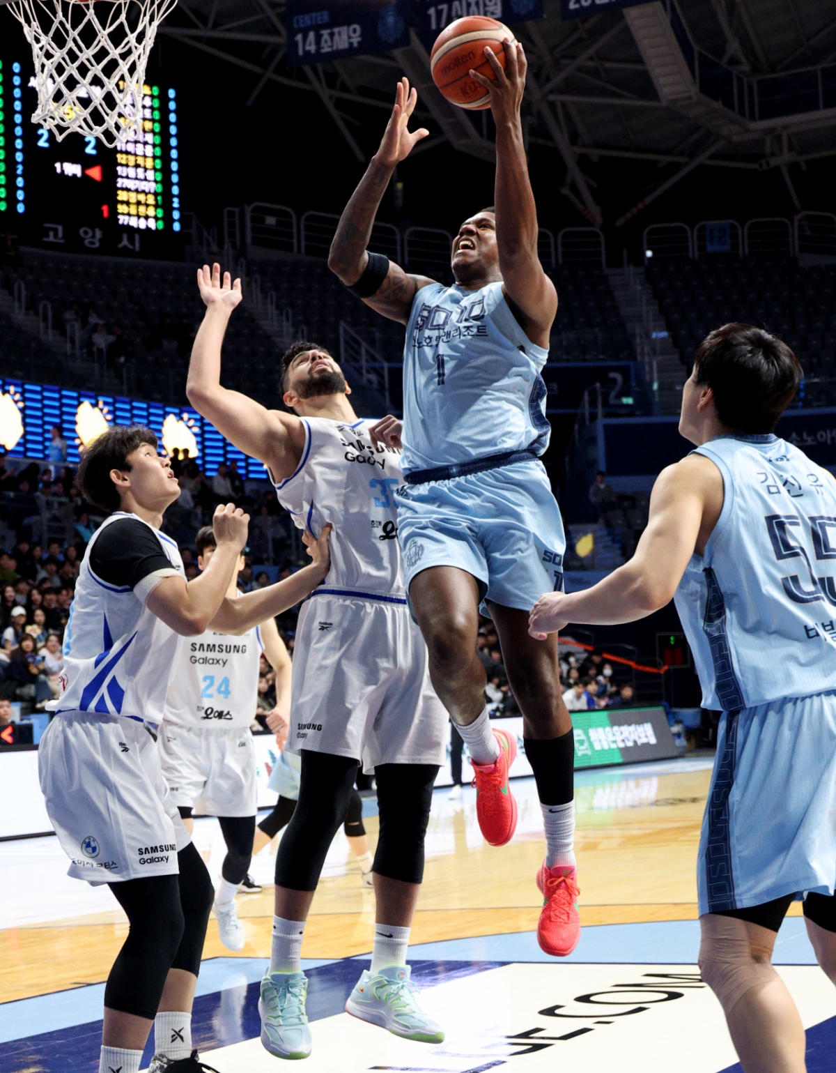 고양소노 나이트가 2026년 2월 19일 고양소노아레나에서 열린 2025-2026 LG전자 프로농구 고양소노와 서울삼성의 경기에서 삼성 칸터의 마크를 받으며 레이업슛을 시도하고 있다.