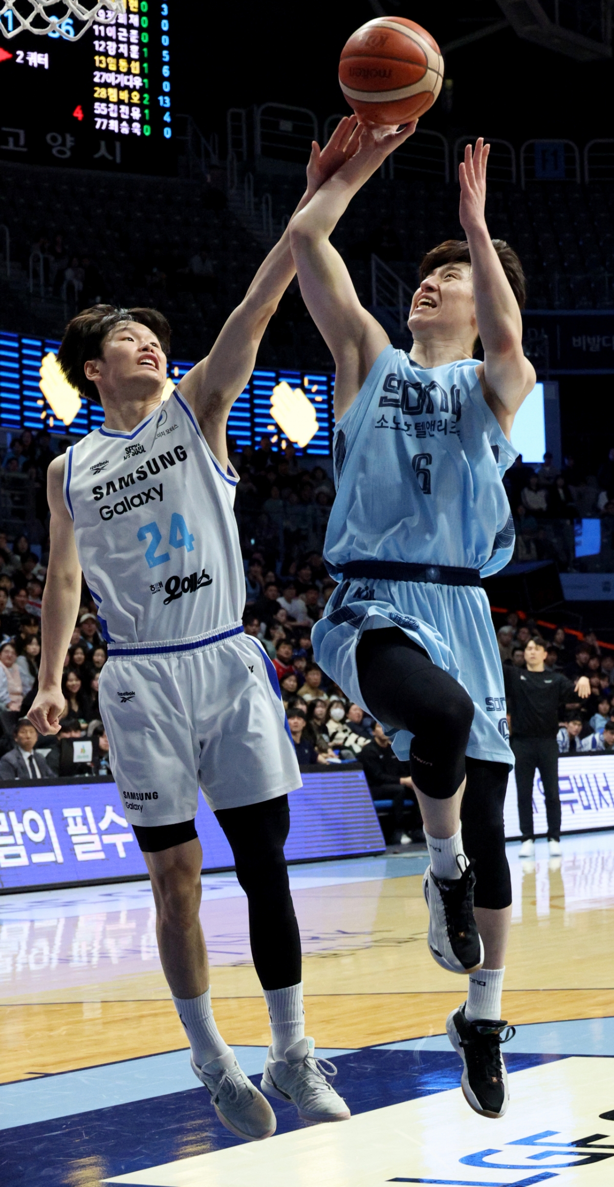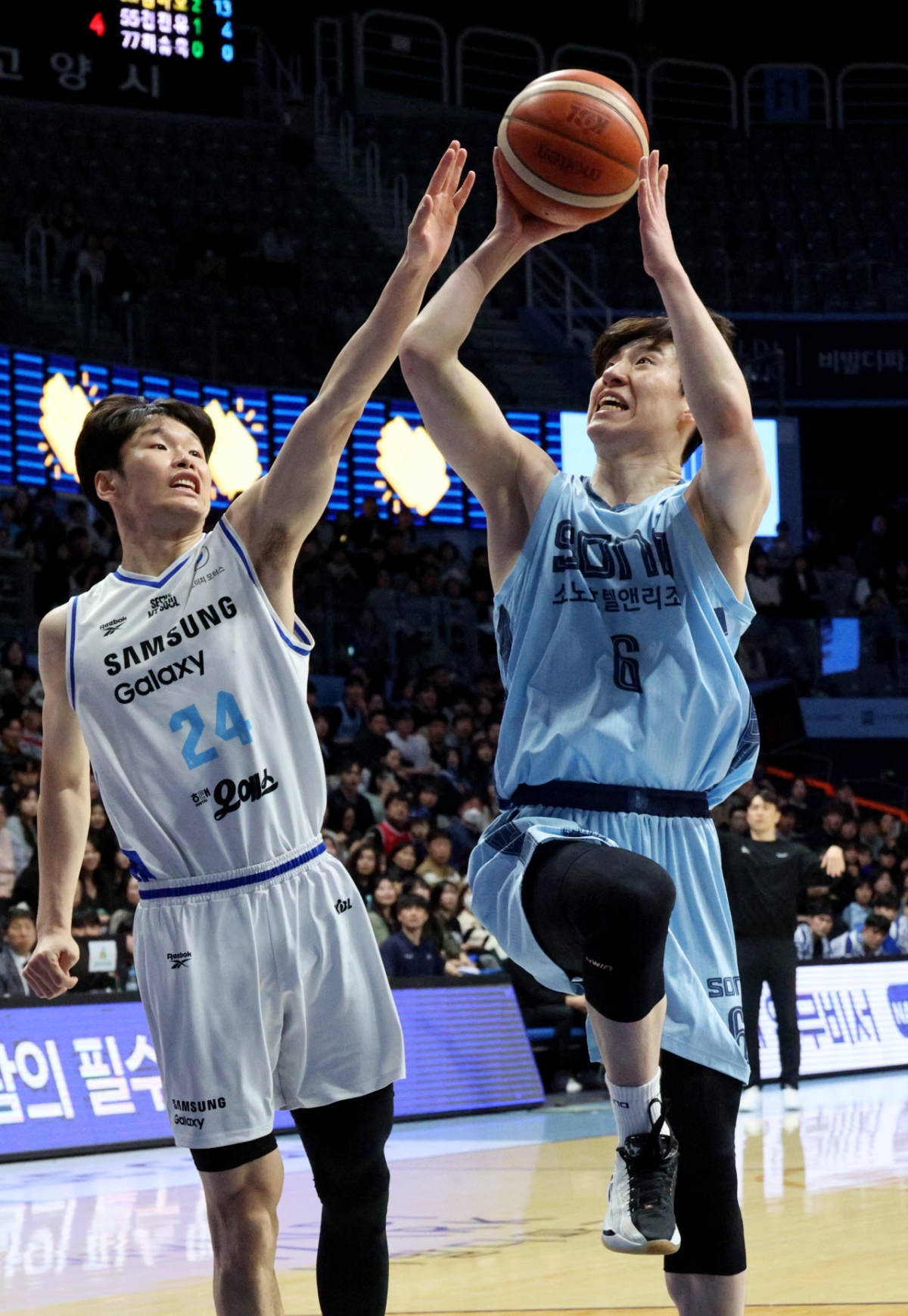 소노 이정현이 2026년 2월 19일 고양소노아레나에서 열린 2025-2026 LG전자 프로농구 고양소노와 서울삼성 경기에서 신동혁의 마크를 받으며 슈팅을 시도하고 있다.