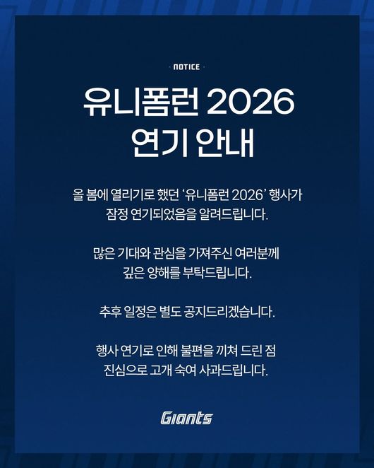 롯데는 안내문을 통해 "올 봄에 열리기로 했던 '유니폼런 2026' 행사가 잠정 연기되었음을 알려드립니다. 많은 기대와 관심을 가져주신 여러분께 깊은 양해를 부탁드립니다. 추후 일정은 별도 공지드리겠습니다"라며 "행사 연기로 인해 불편을 끼쳐 드린 점 진심으로 고개 숙여 사과드립니다"라고 고개를 숙였다.