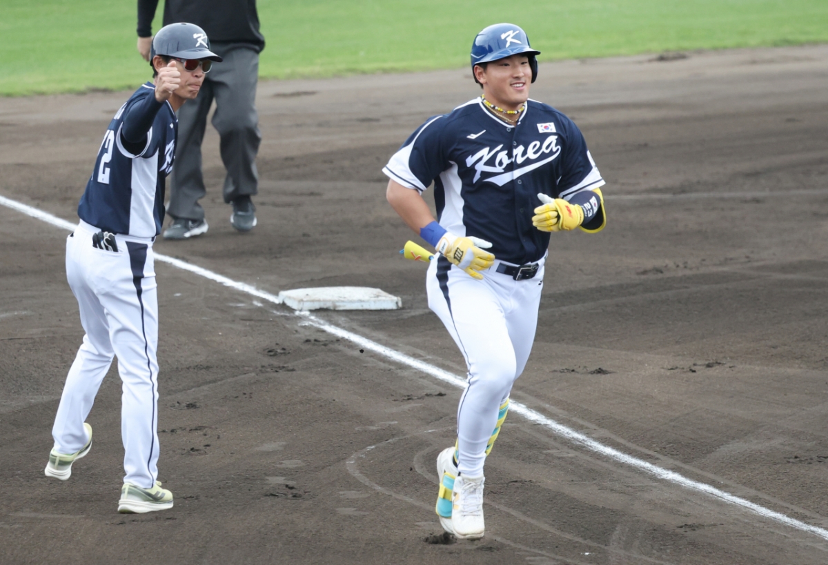대표팀 안현민이 1회초 삼성 선발 최원태를 상대로 1점 홈런을 날리고 홈인하고 있다.