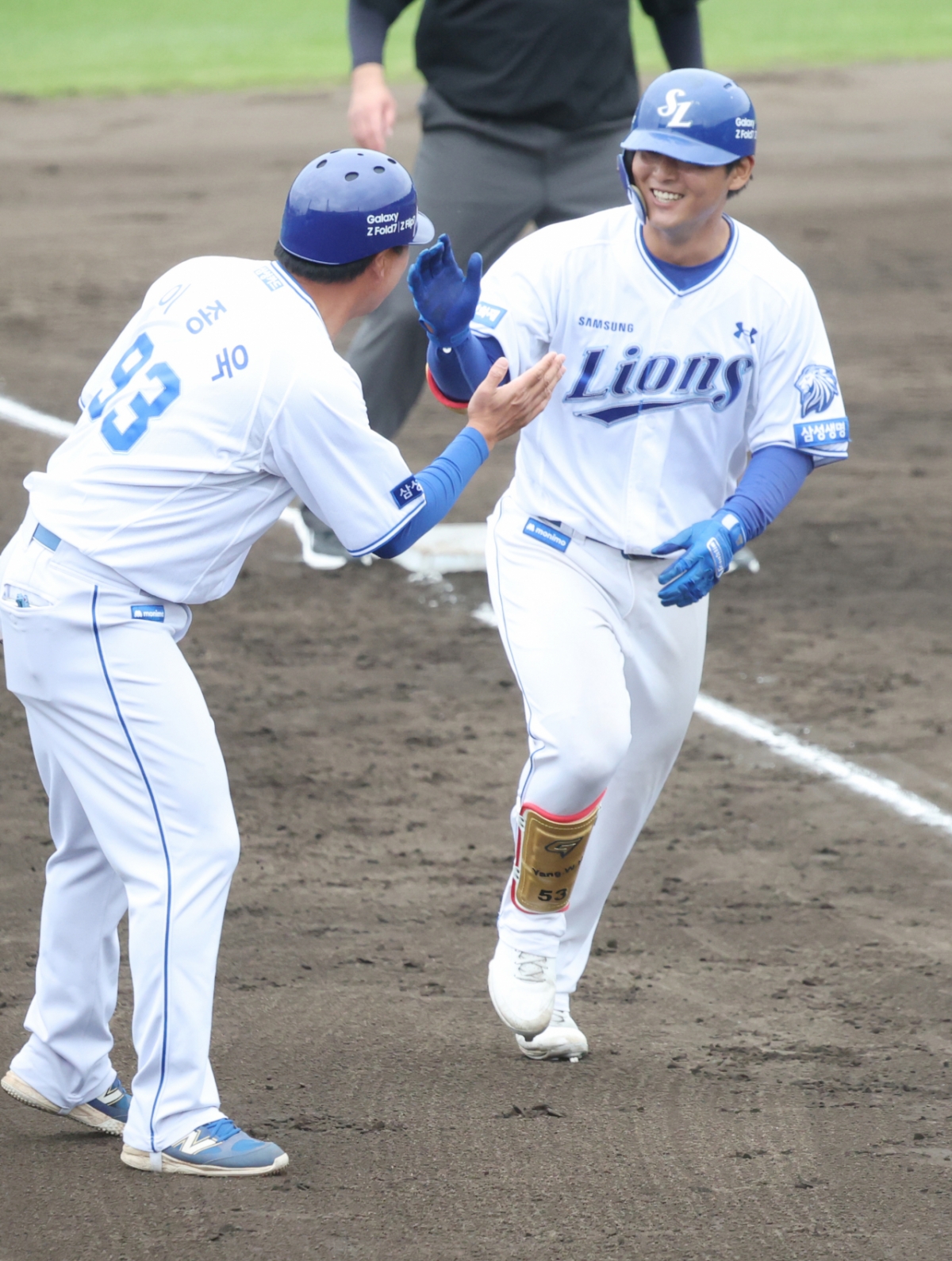 삼성 양우현이 4회말 대표팀 정우주를 상대로 역전 3점 홈런을 날리고 홈인하고 있다.