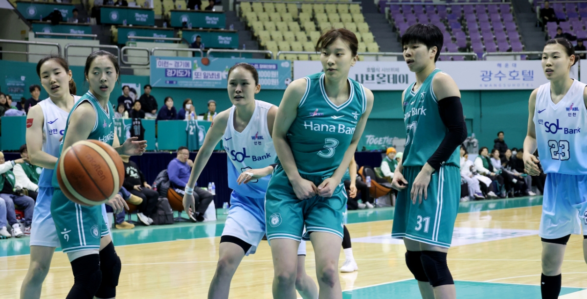 신한 정현, 하나 황현정 등 양팀 선수들이 20일 부천실내체육관에서 열린 BNK금융 2025-2026 WKBL 하나은행과 신한은행 경기에서 터치아웃되는 볼을 바라보고 있다.