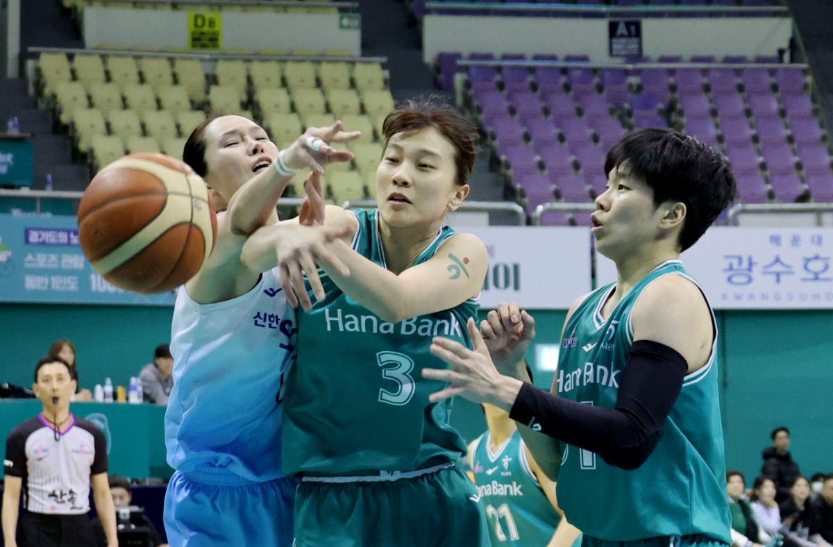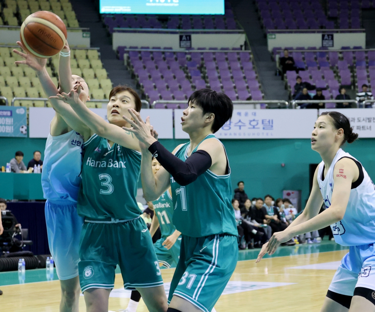신한 정현과 하나 황현정이 20일 부천실내체육관에서 열린 BNK금융 2025-2026 WKBL 하나은행과 신한은행 경기에서 치열한 리바운드 다툼을 벌이고 있다.
