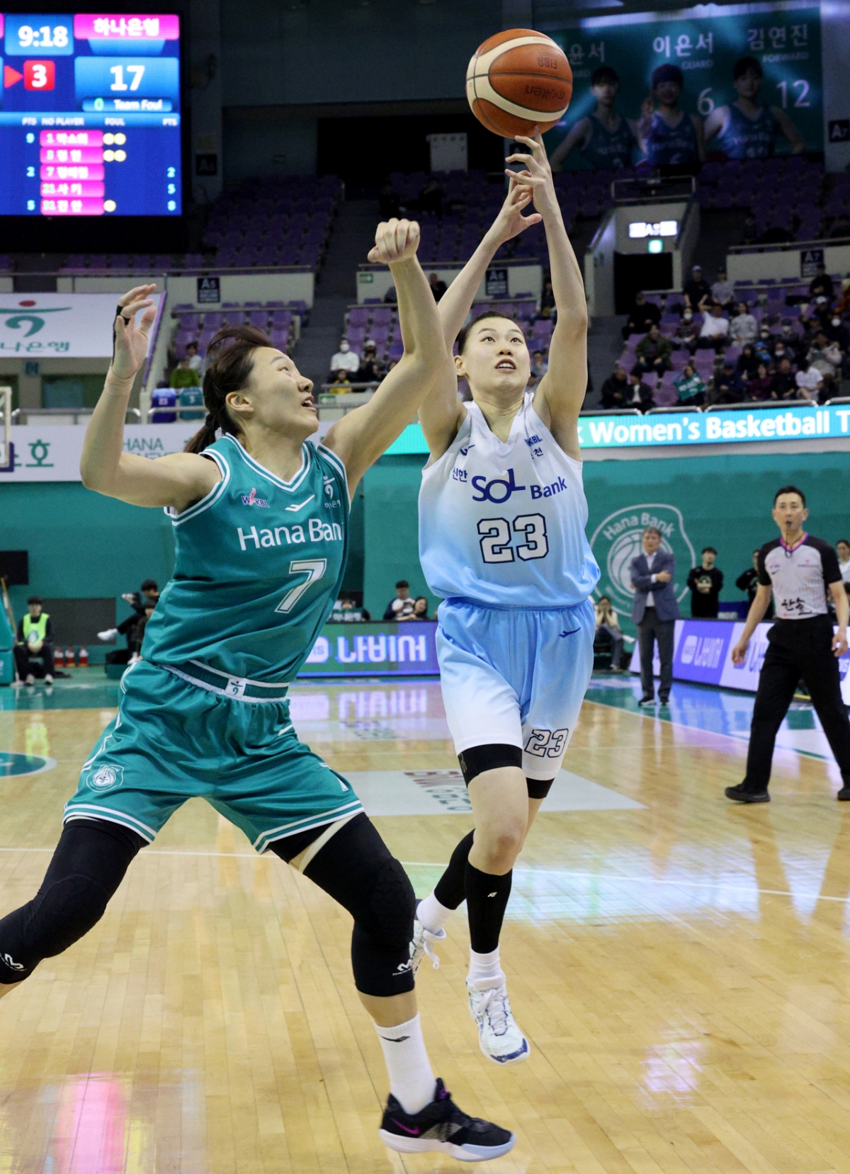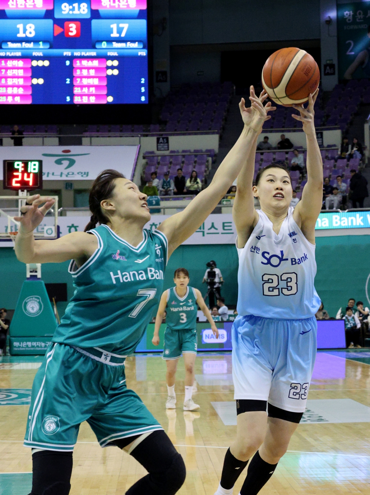 신한 홍유순이 2026년 2월 20일 부천실내체육관에서 열린 BNK금융 2025-2026 WKBL 하나은행과 신한은행 경기에서 정예림과 리바운드를 다투고 있다.
