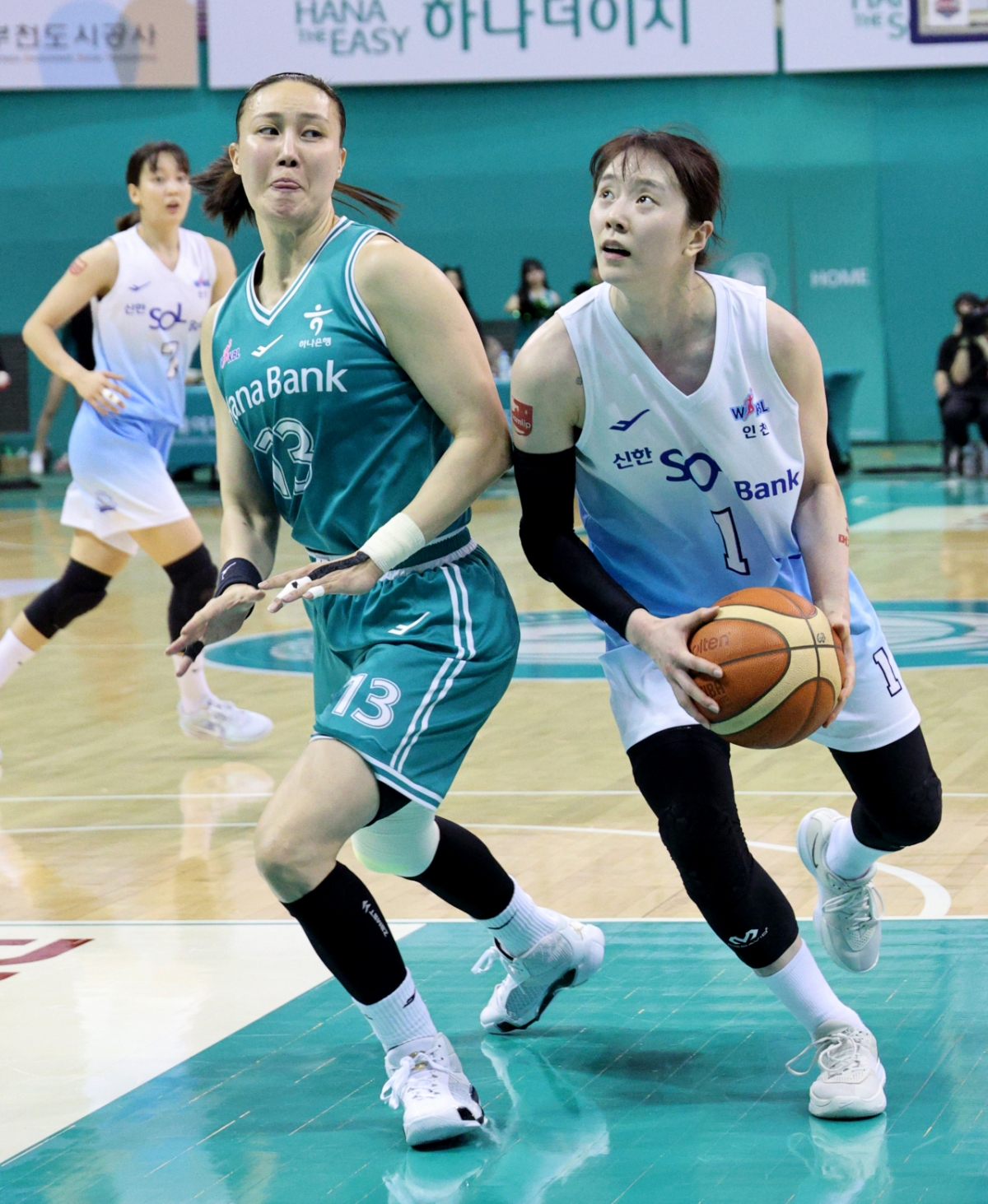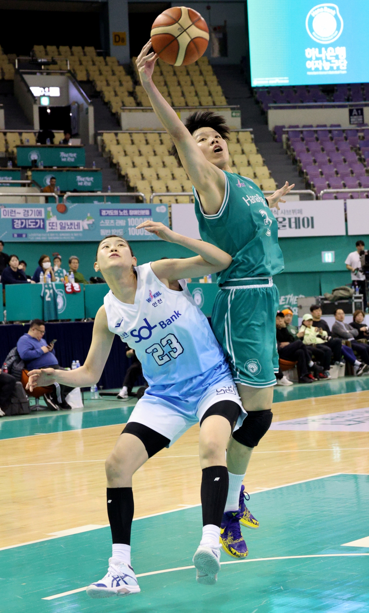 신한 미마 루이가 20일 부천실내체육관에서 열린 BNK금융 2025-2026 WKBL 하나은행과 신한은행 경기에서 정현과 치열한 리바운드 다툼을 벌이고 있다.