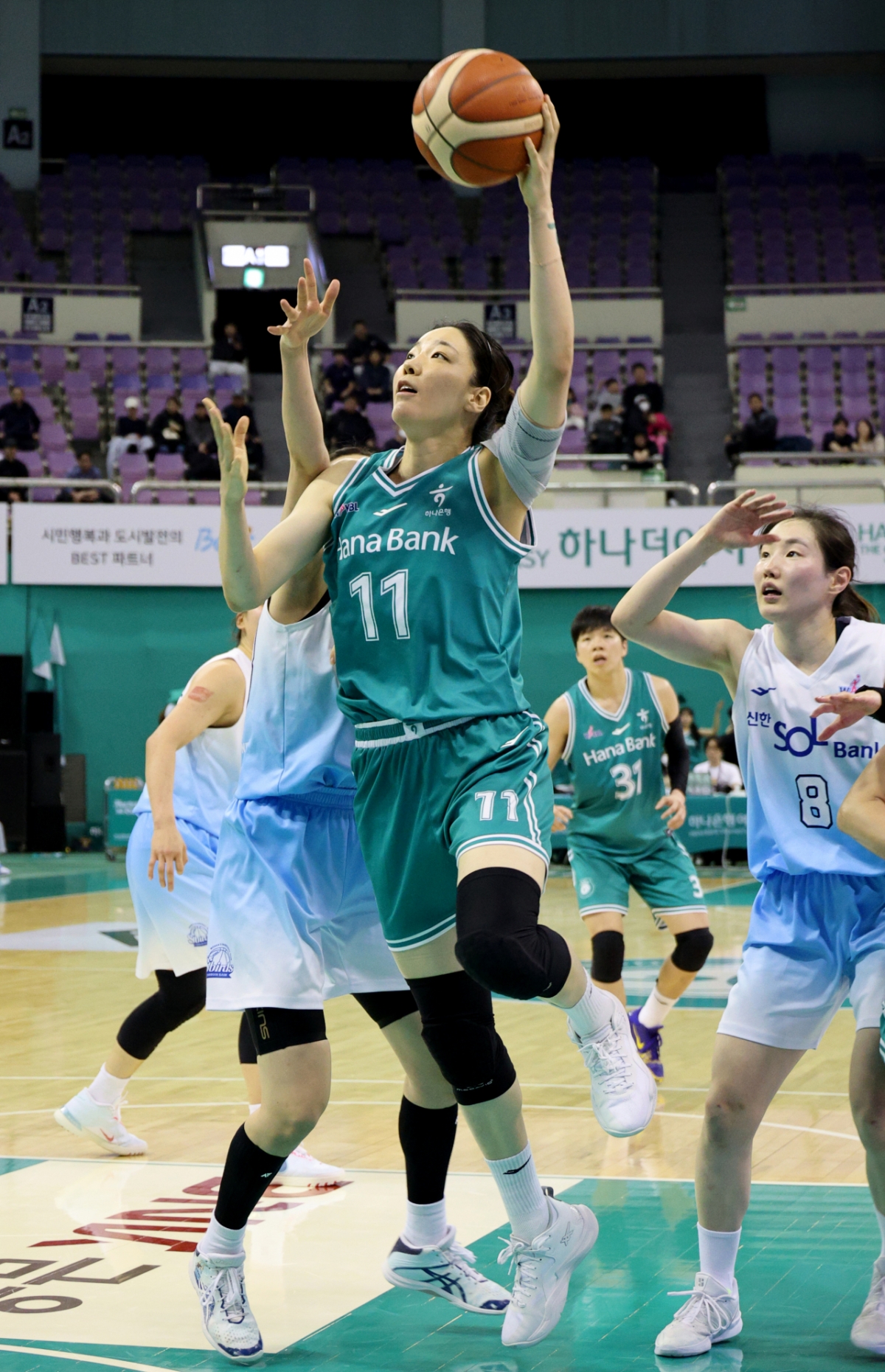 전광판엔 3분 25초를 남기고 47-35로 신한이 앞서있다