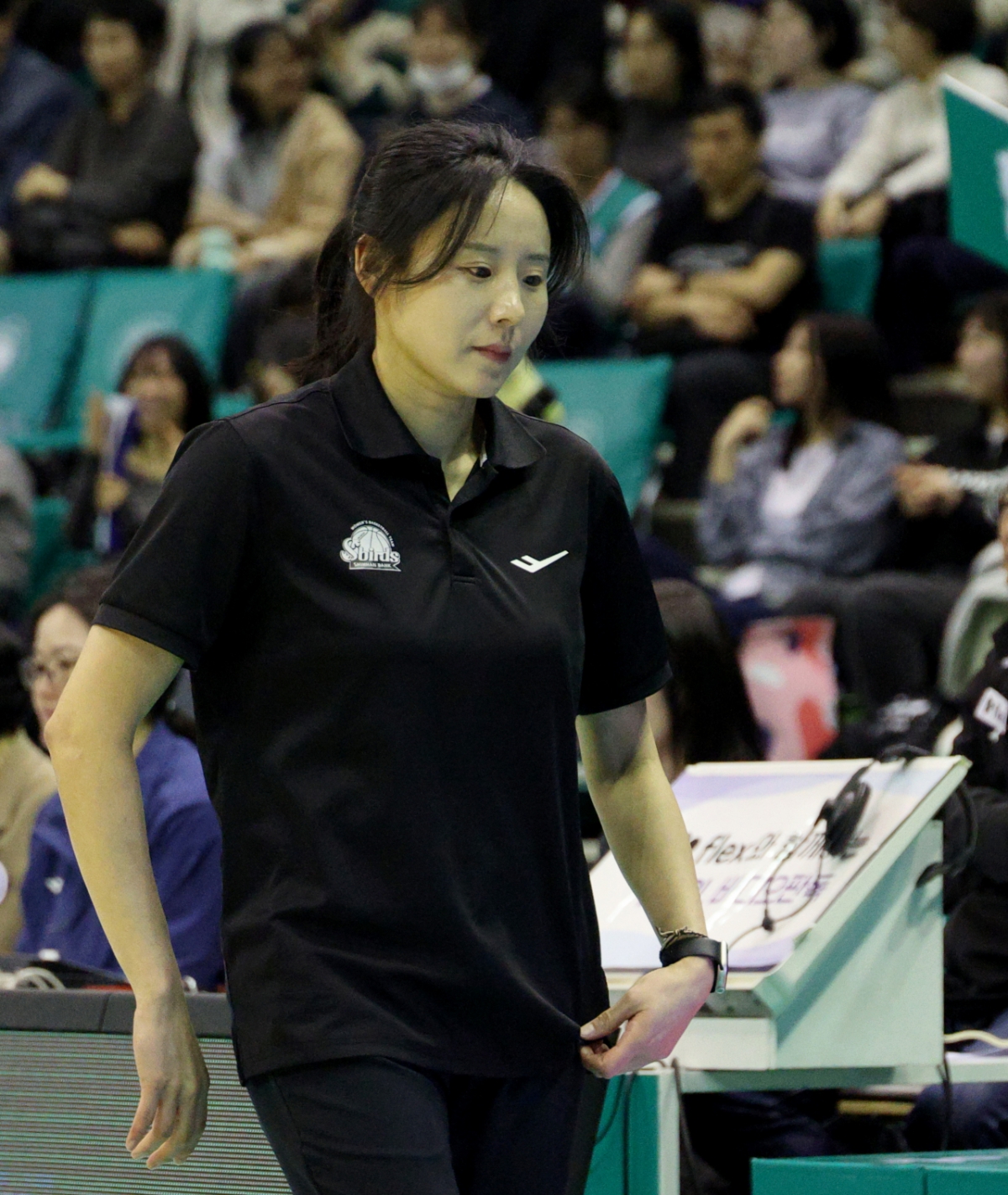 신한 최윤아 감독이 20일 부천실내체육관에서 열린 BNK금융 2025-2026 WKBL 하나은행과 신한은행 경기에서 생각에 잠겨 있다. 최윤아 감독의 첫승은 하나은행을 상대한 홈경기였다.