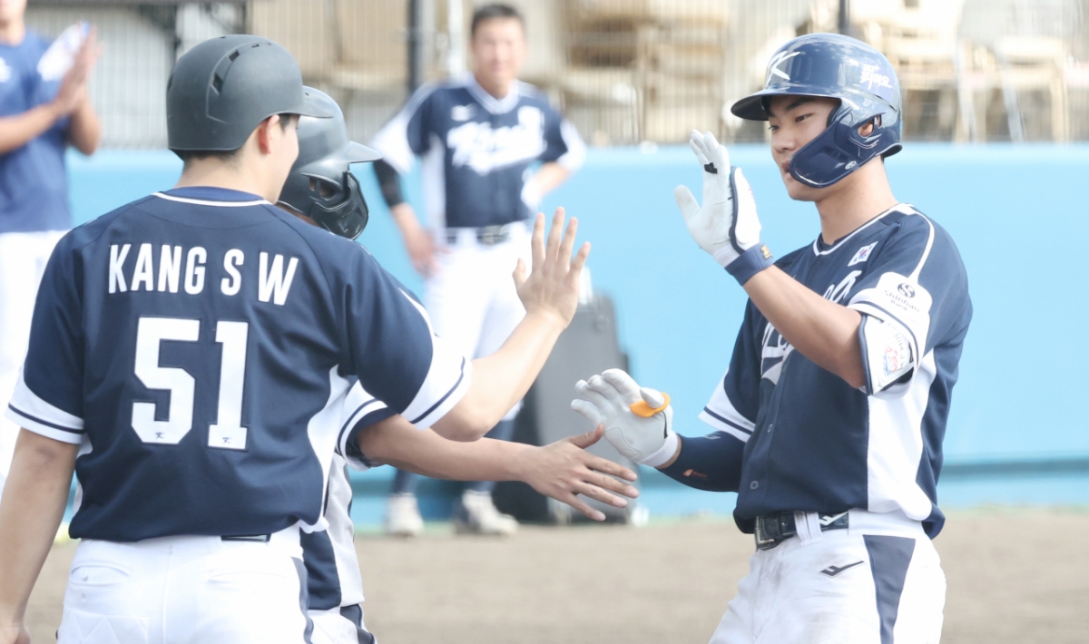 대표팀 김주원이 7회초 무사 1,2루에서 한화 황준서를 상대로 역전 3점 홈런을 날리고 홈인하고 있다.