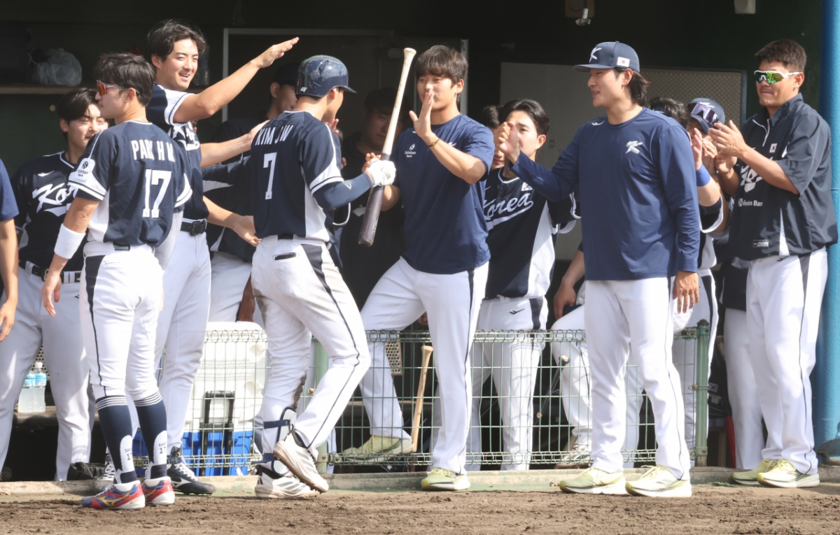 WBC 한국 야구 대표팀이 일본 오키나와현 야에세 고친다 구장에서 한화 이글스와 연습경기를 가졌다. 대표팀 김주원이 7회초 무사 1,2루에서 한화 황준서를 상대로 역전 3점 홈런을 날렸다.