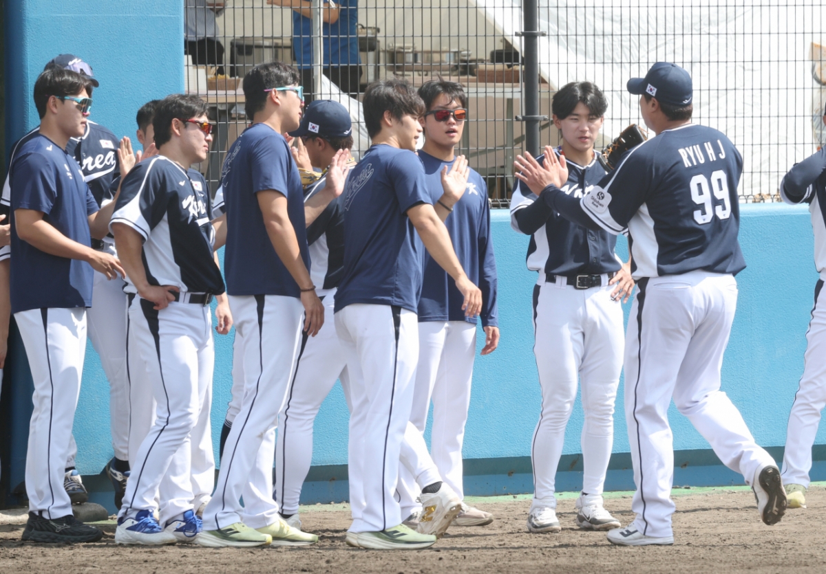 대표팀 선발 류현진이 2회 투구를 마친 후 더그아웃에서 동료들의 환영을 받고 있다.