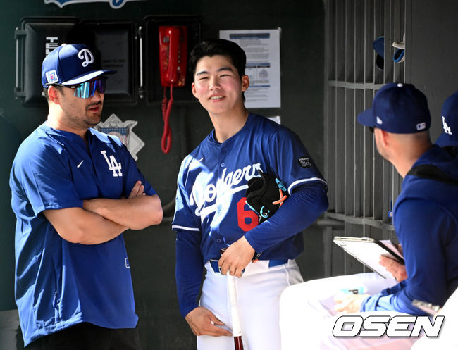 [OSEN=이후광 기자] ‘혜성특급’ 김혜성(LA 다저스)이 첫 시범경기 미친 활약에 힘입어 경기 도중 현지 중계진과 단독 인터뷰를 하는 영광을 누렸다. 김혜성은 이날 결승타 포함 2안타-3타점 활약 비결은 물론 꿀피부 유지 비결까지 밝히며 K-뷰티의 우수성을 전파했다.