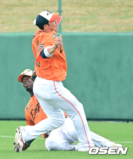 2아웃 상황에서 지바롯데 우에다 큐토가 타석에 들어섰다. 조동욱을 상대로 빗맞은 오른쪽 뜬공을 쳤다. 2루수 하주석과 우익수 페라자 사이 내야 라인을 살짝 넘어가는 타구였다. 잡으면 기나긴 4회가 끝나는 상황. 우익수로 선발 출격한 페라자는 타구를 잡기 위해 전력으로 뛰었다. 수비력이 좋은 2루수 하주석도 등 뒤로 넘어가는 타구를 향해 포기하지 않고 뛰었다.