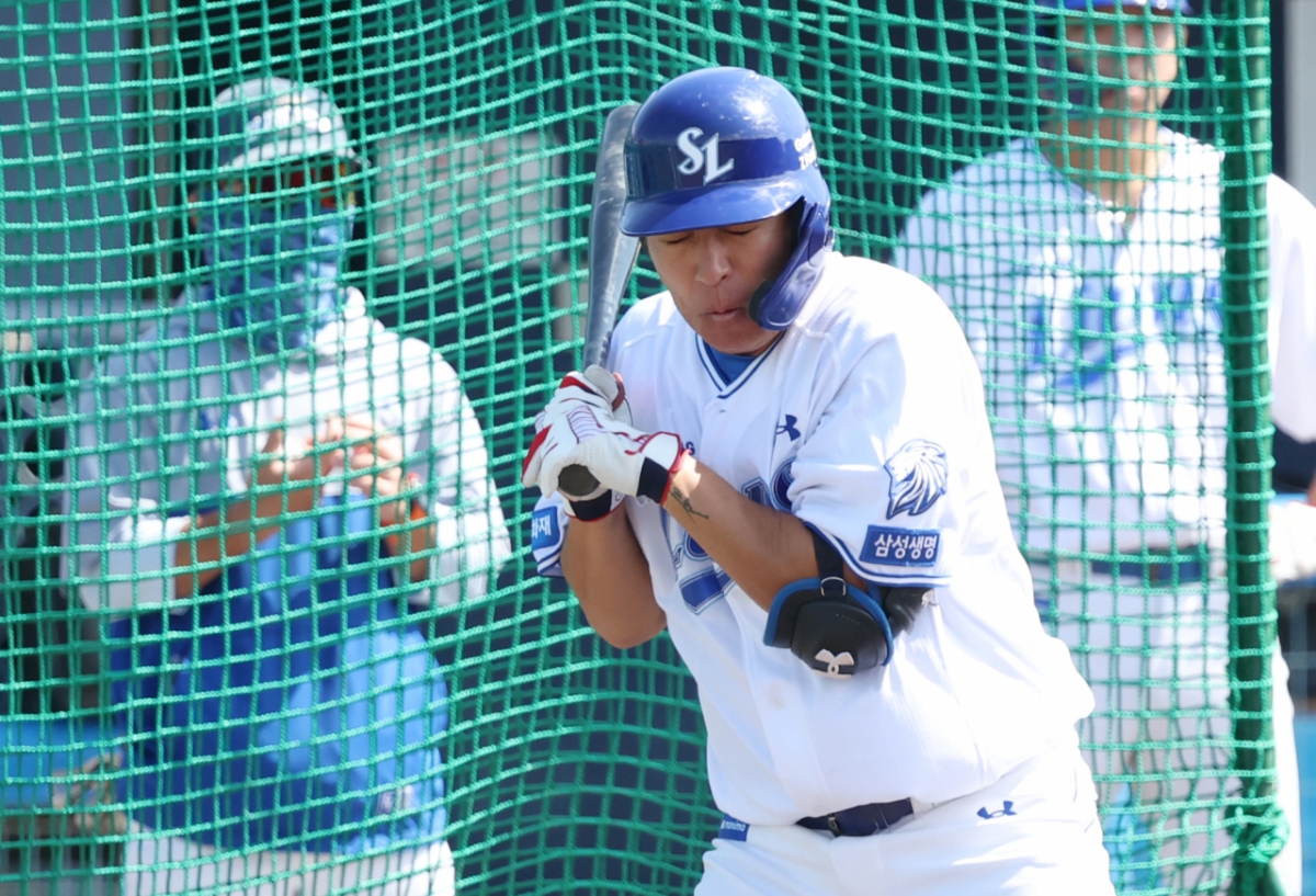 [포토] 강민호 '라이브 배팅에 데드볼이라니'