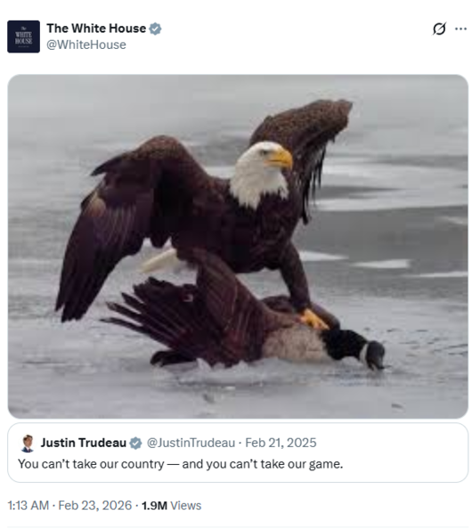 이번 밀라노 올림픽 하키 여자와 남자 모두 결승서 캐나다를 잡고 메달을 차지하자 미국이 바로 복수에 나섰다. 백악관 공식 SNS에서는 1년여전의 트뢰도 총리의 SNS를 리트윗하면서 독수리(미국의 상징 동물)이 캐나다를 상징하는 새를 잡는 사진을 올리면서 조롱했다.