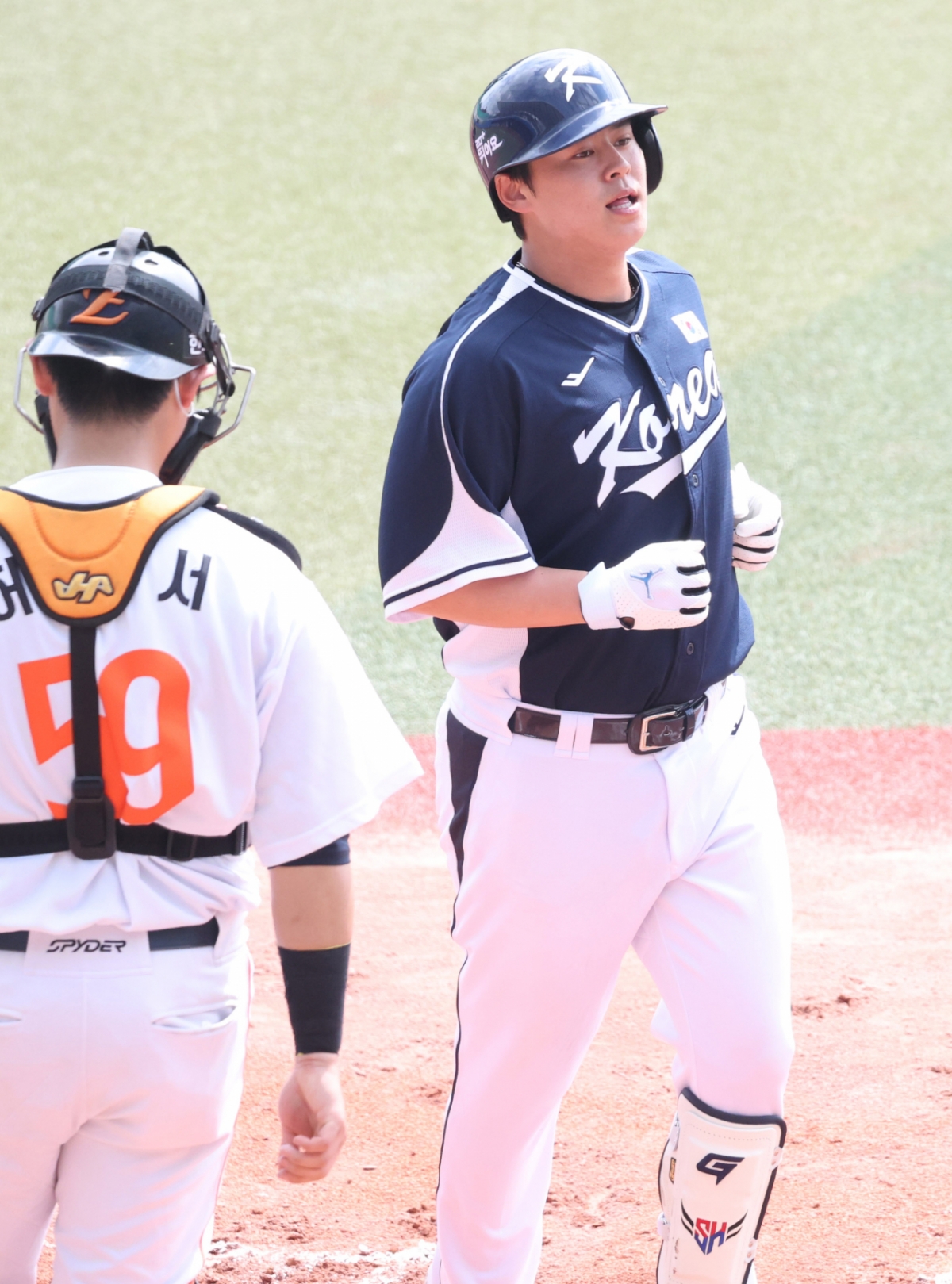 대표팀 노시환이 2회초 무사 1루에서 한화 선발 화이트를 상대로 선제 2점 홈런을 날리고 홈인하고 있다.