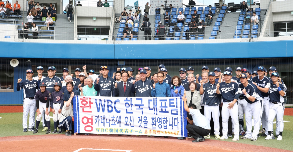 WBC 한국 야구 대표팀이 일본 오키나와현 카데나 야구장에서 한화 이글스와 연습경기를 가졌다. 경기 전 카데나초가 주관하는 환영식이 열렸으며, 류지현 감독을 비롯한 선수단이 기념촬영을 했다.