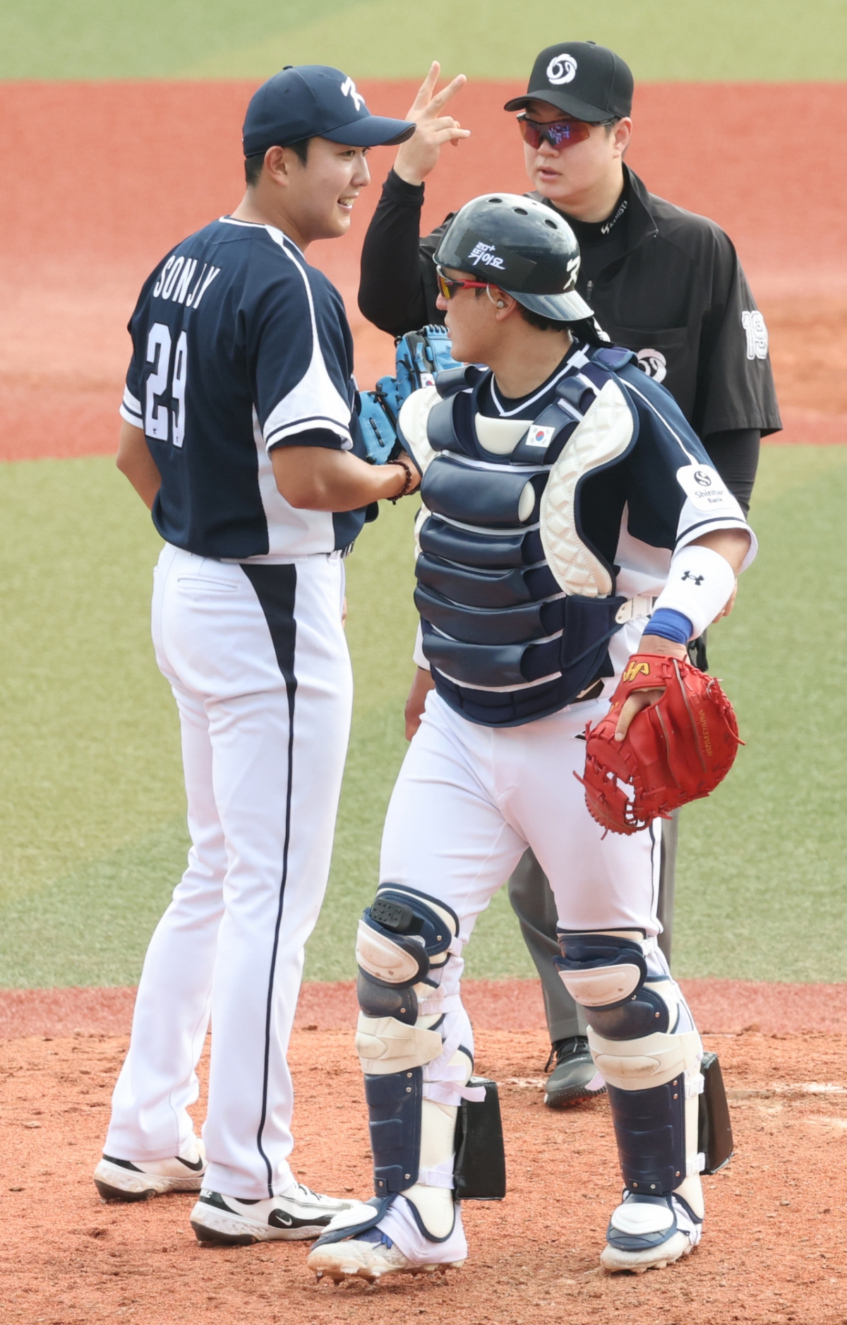 대표팀 손주영이 흔들리는 모습을 보이자 포수 박동원이 마운드로 가 진정시키고 있다.