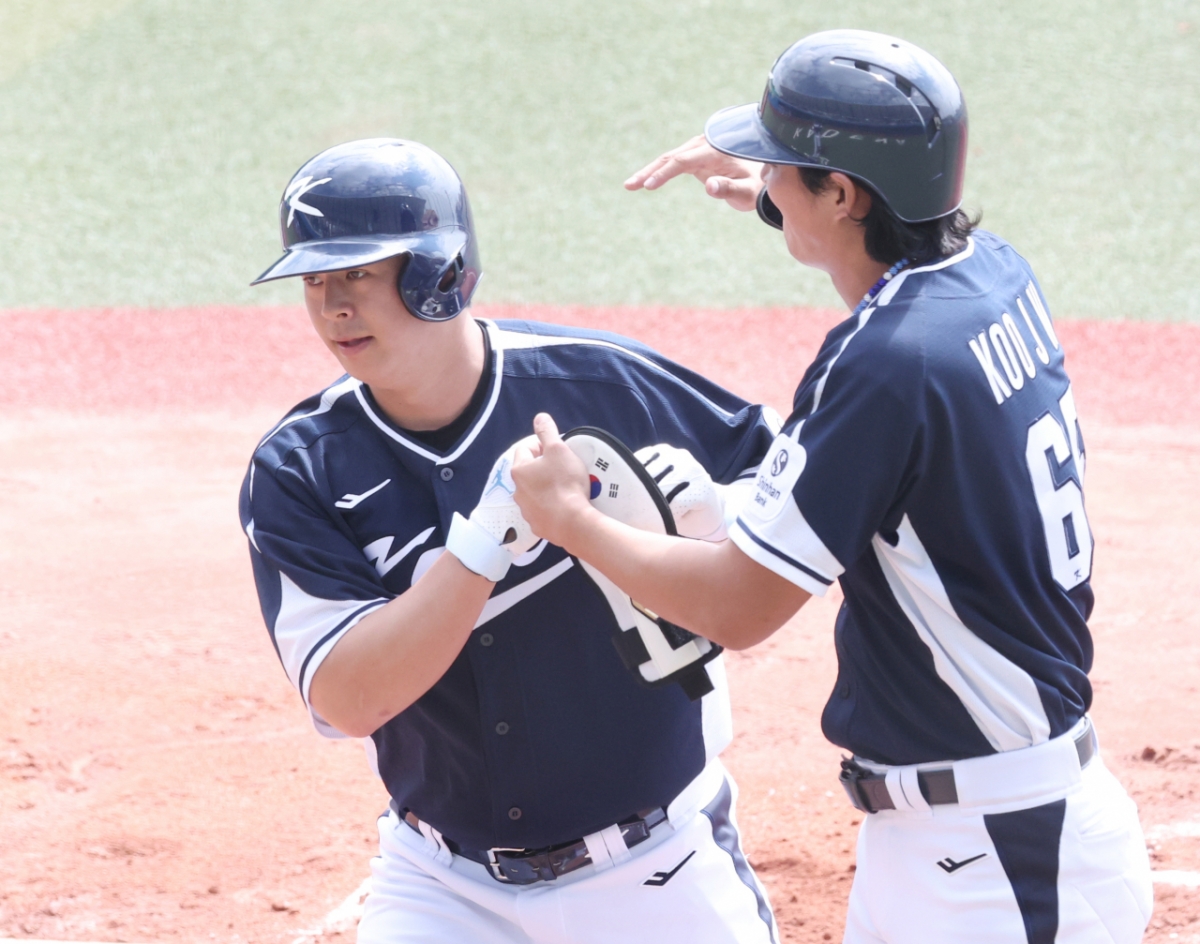 대표팀 노시환이 2회초 무사 1루에서 한화 선발 화이트를 상대로 선제 2점 홈런을 날리고 홈인한 후 구자욱의 환영을 받고 있다.