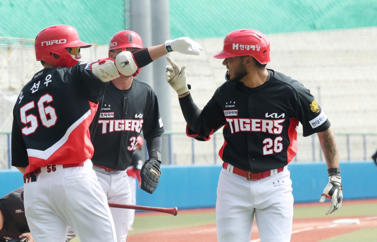 KIA 카스트로가 1회초 선제 우월 2점 홈런을 날리고 홈인하고 있다.