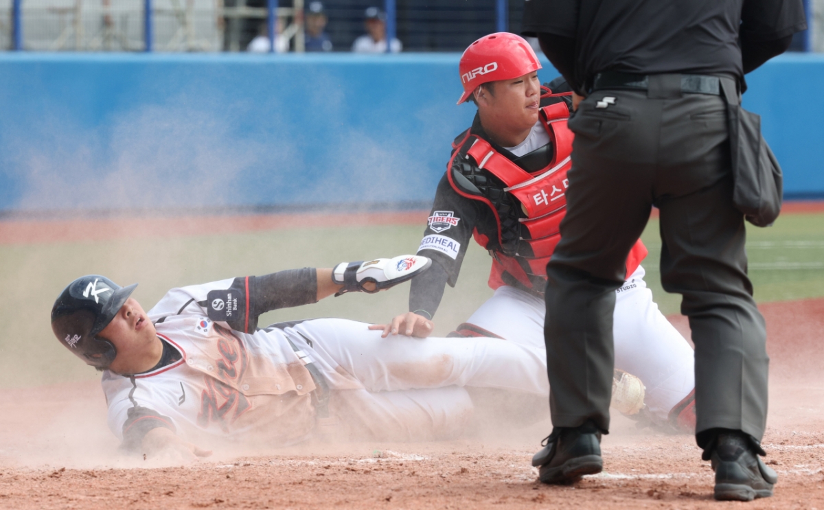 대표팀 3회말 1사 2,3루에서 3루주자 문현빈이 신민재의 내야땅볼 때 홈으로 뛰었으나 태그아웃되고 있다.