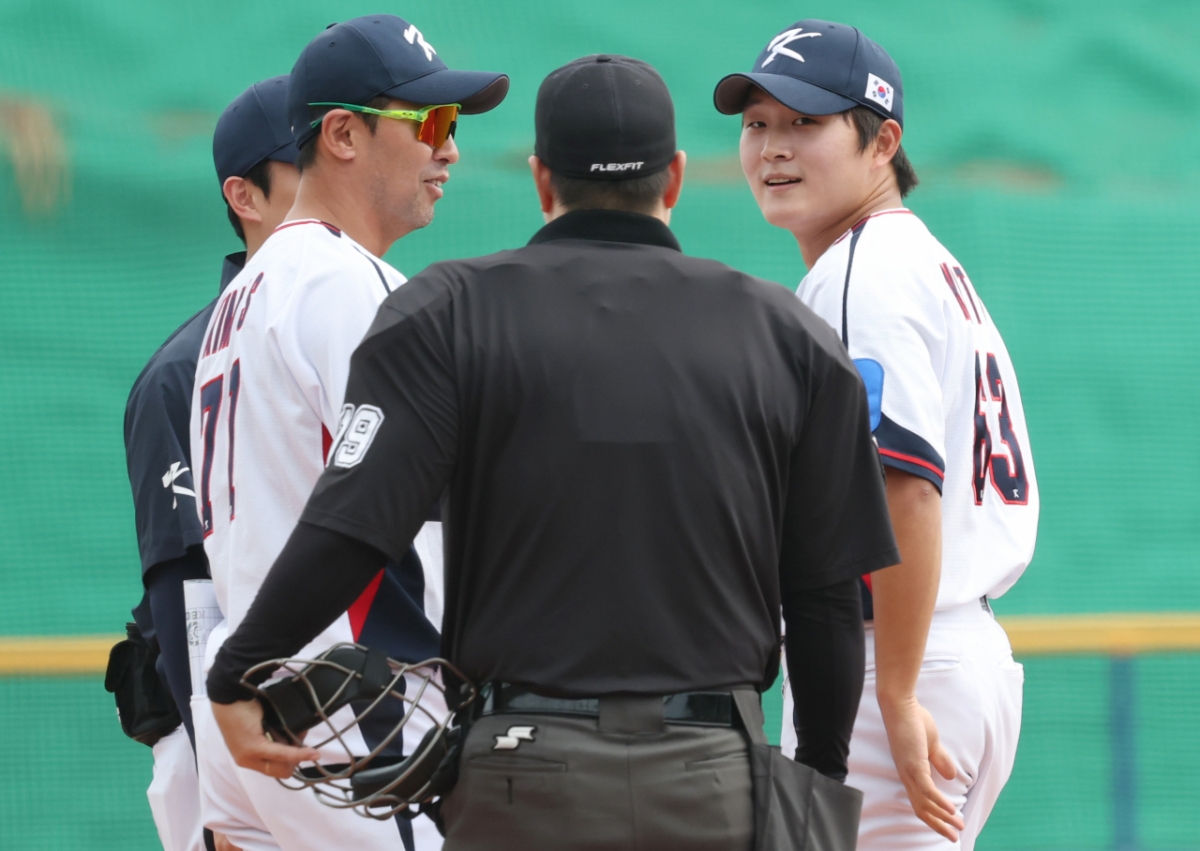 대표팀 김택연이 5회초 2사 KIA 박재현의 강습 타구가 글러브에 스치자 김광삼 투수 코치가 마운으로 올라가 상태를 살피고 있다.