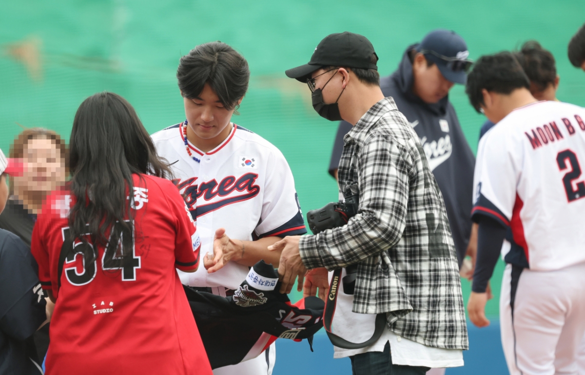 김도영, 류현진을 비롯한 대표팀 선수들이 경기 후 응원단에 사인을 해주고 있다.