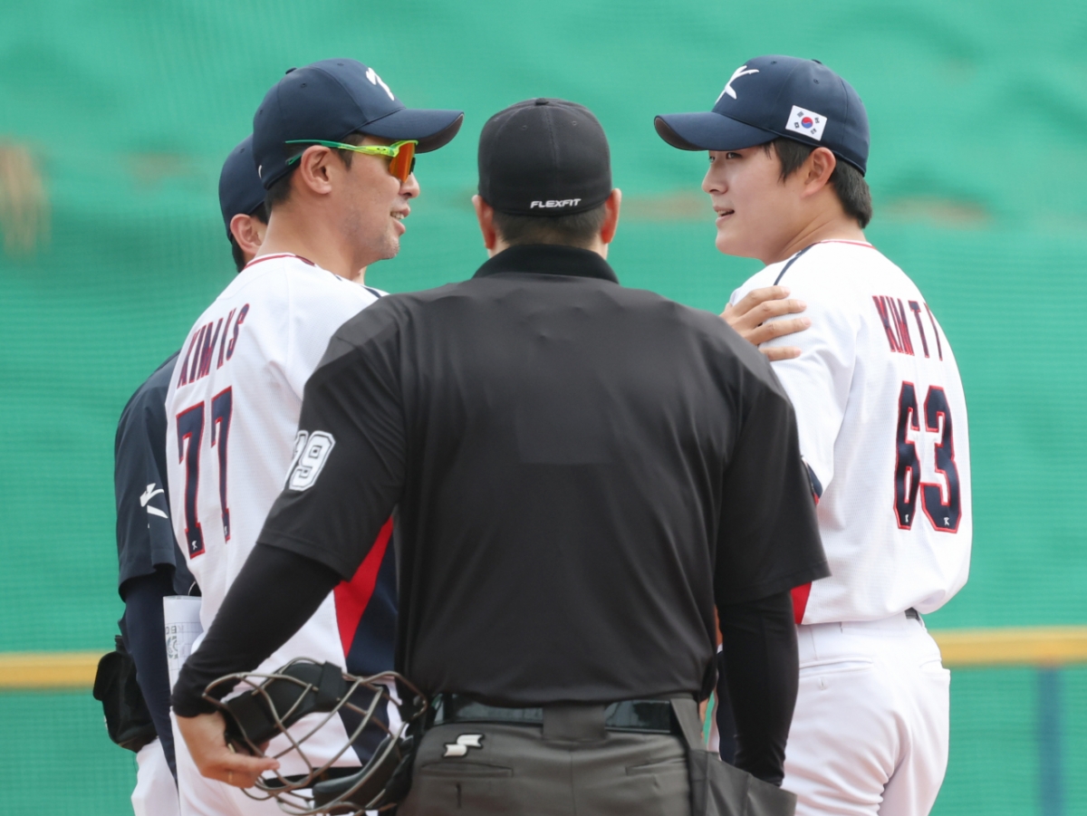 KIA 박정우를 삼진으로 돌려세운 김택연은 1사에서 제리드 데일이 친 타구에 글러브를 맞았다. 이 장면에 놀란 김광삼 대표팀 투수 코치가 화들짝 놀라 마운드로 향했다