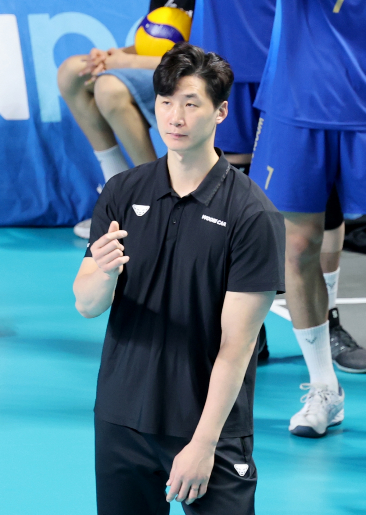 박철우 감독대행이 25일 장충체육관에서 열린 V리그 남자부 우리카드와 OK저축은행 경기에서 선수들에게 하트를 보냈다.