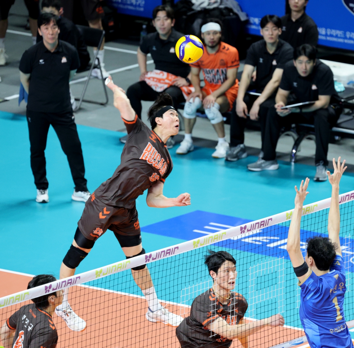 OK 전광인이 25일 장충체육관에서 열린 V리그 남자부 우리카드와 OK저축은행 경기에서 후위공격을 시도했다.