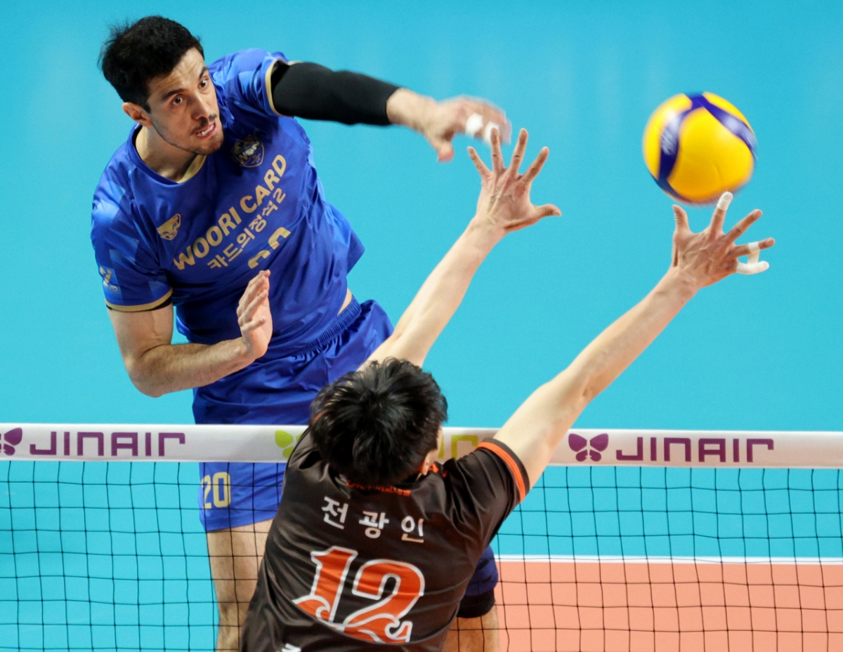 우리 아라우조가 25일 장충체육관에서 열린 진에어 2025-2026V리그 남자부 우리카드와 OK저축은행과의 경기에서 전광인 블로킹을 뚫고 있다.. 2026.02.25.