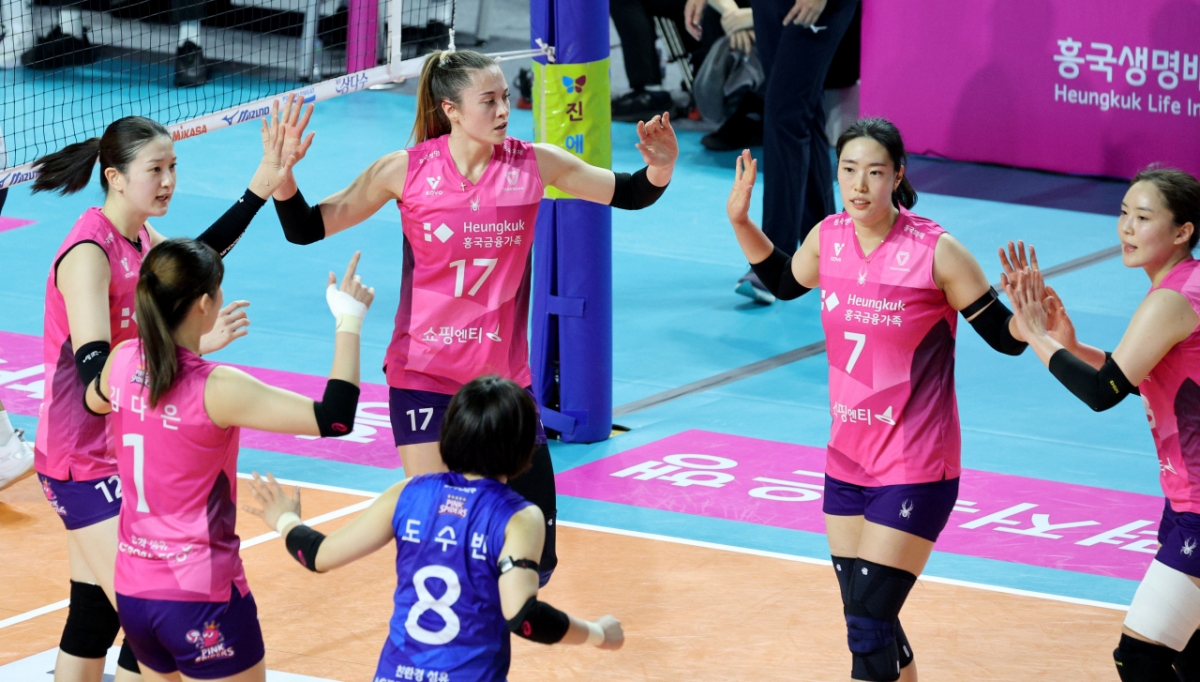 흥국 레베카가 27일 삼산월드체육관에서 열린 진에어 2025-2026V리그 여자부 흥국생명과 GS칼텍스 경기에서 득점한 후 동료들과 자축하고 있다.2026.02.27.