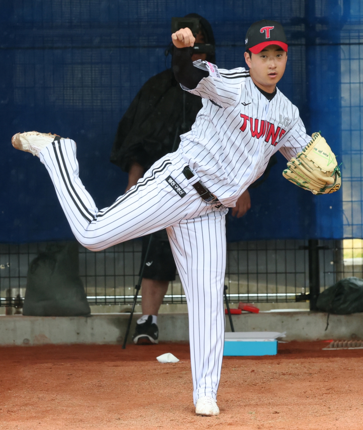 김진수가 불펜 피칭 훈련을 하고 있다.
