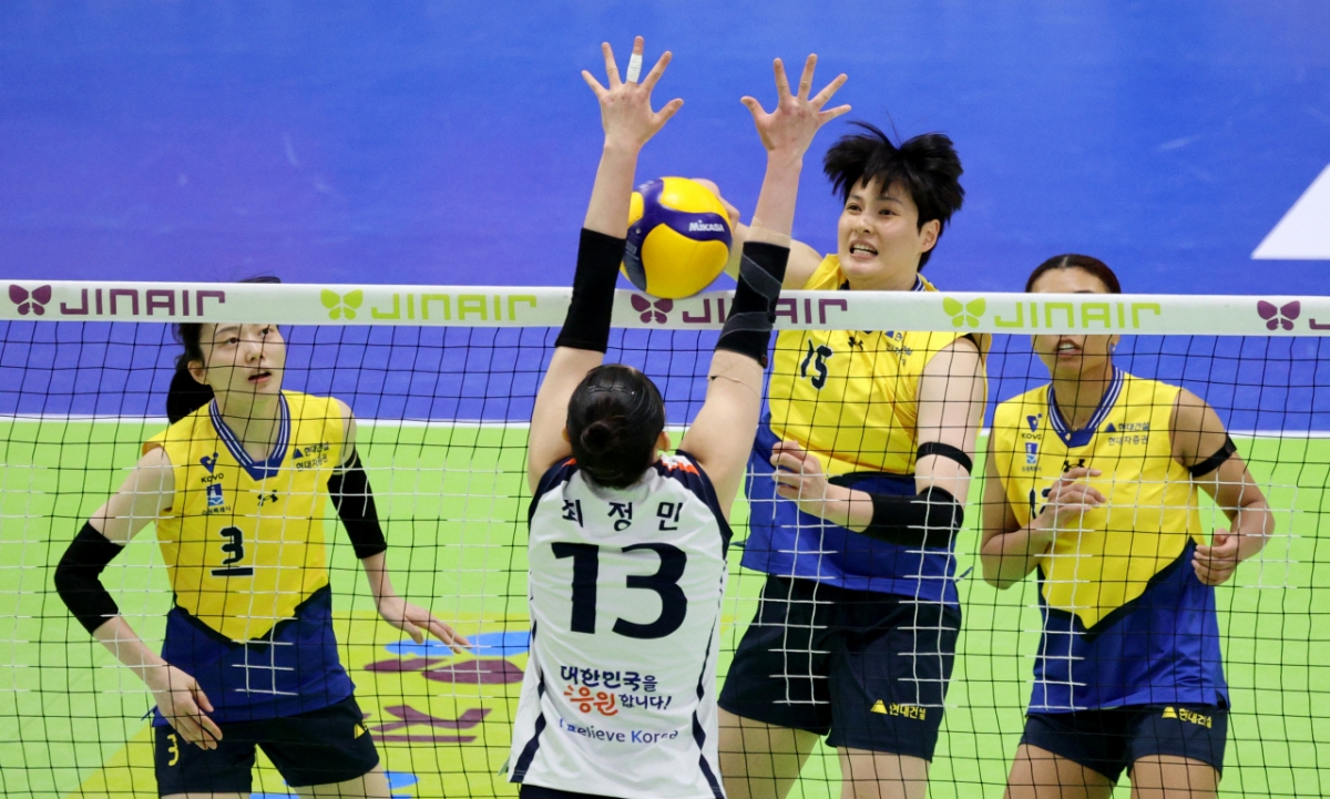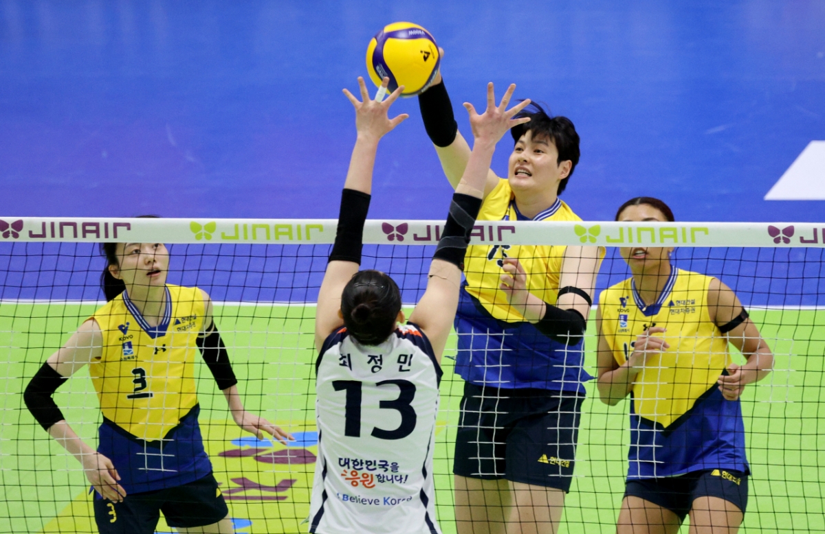 현대 김희진이 28일 수원체육관에서 열린 진에어 2025-2026V리그 여자부 현대건설과 IBK기업은행 경기에서 IBK 블로킹에 강타를 시도하고 있다. 2026.02.28.