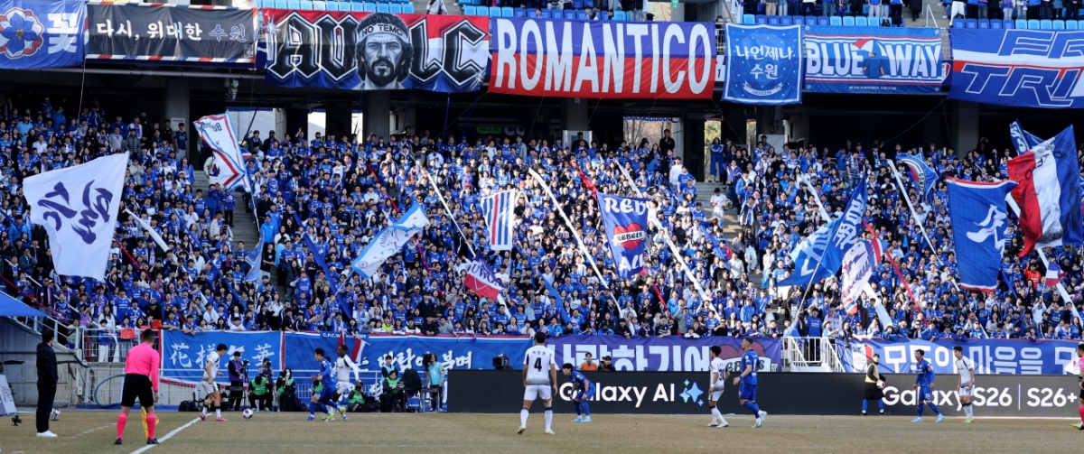이정효 감독이 28일 수원월드컵경기장에서 열린 2026하나은행 K리그2 수원삼성과 이랜드 경기에서 데뷔전을 치르는 가운데 많은 수원삼성 서포터즈들이 응원을 펼치고 있다. 2026.02.28.
