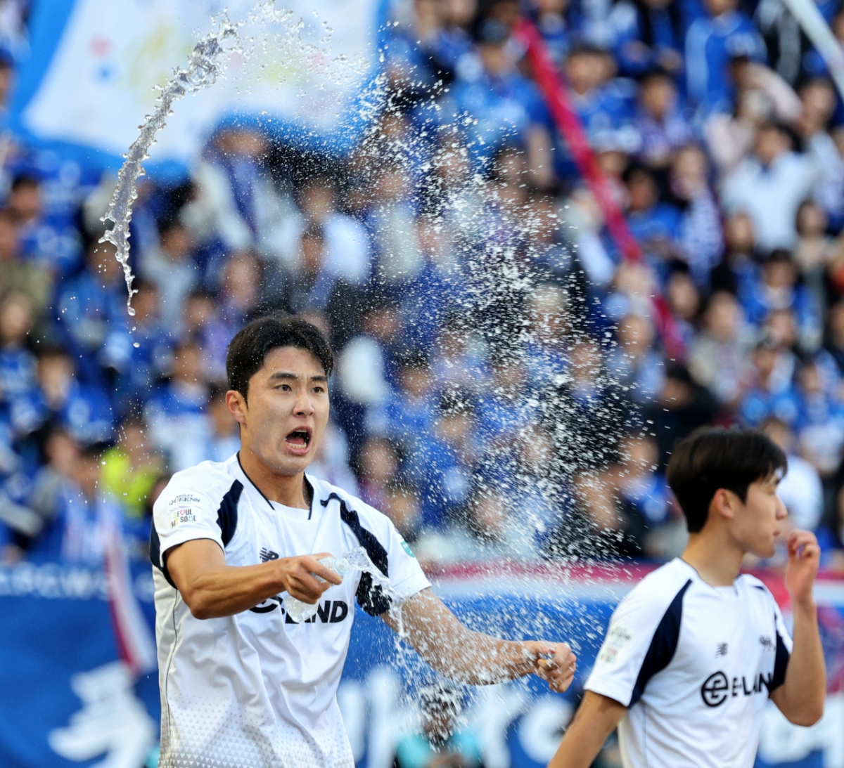 이랜드의 박재용 선수가 2026하나은행 K리그2 수원삼성과의 경기에서 선제골을 넣은 후 생수를 뿌리며 기뻐했다. 이 경기는 2월 28일 수원월드컵경기장에서 열렸다. 박재용 선수는 이랜드 소속으로 수원삼성을 상대로 득점을 기록했다.