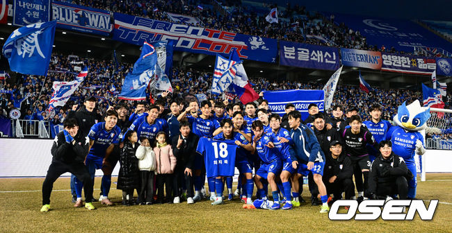 수원 선수단은 팬들 앞에서 만세 삼창을 외치며 승리를 즐겼다. 다만 뭉클한 장면도 있었다. 바로 안타까운 부상으로 수술을 앞둔 동료 최지묵의 등번호 18번 유니폼을 들어 올리며 승리 기념사진을 찍었다. 수원 관계자에 따르면 최지묵은 오른쪽 무릎 반월상 연골 손상이 확인돼 며칠 뒤 수술대에 오를 예정이다.