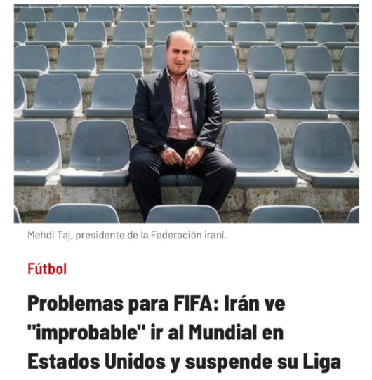 중국 매체 '넷이즈'는 1일(한국시간) 스페인 '마르카'의 보도를 인용해 "이란 축구 연맹의 메흐디 타지 회장이 국가대표팀의 월드컵 기권 가능성을 공식 확인했다"라고 전했다.
