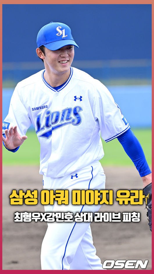 이날 삼성 아시아쿼터 미야지 유라는 최형우, 강민호를 상대로 라이브피칭을 펼치며 컨디션을 끌어올렸다.