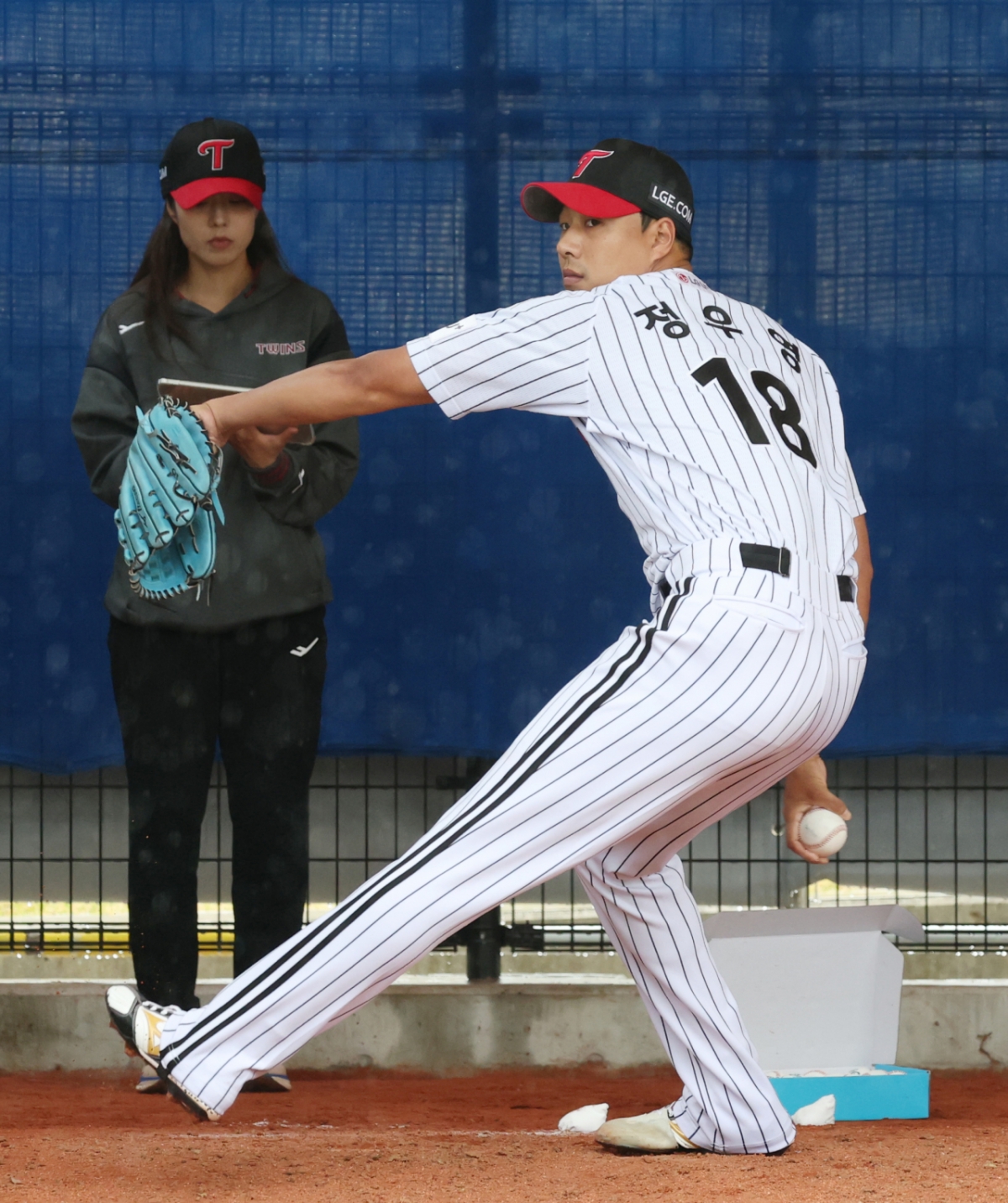 LG 트윈스가 27일 일본 오키나와현 카데나 야구장에서 스프링캠프 일정을 진행했다. 정우영이 불펜 피칭 훈련을 하고 있었다.