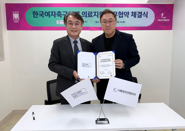 [OSEN=고성환 기자] 한국여자축구연맹(이하 연맹)이 지난 26일 서울인화스포츠마취통증의학과(이하 인화스포츠), 서울점프정형외과(이하 점프정형외과)와 연맹 기본 의료체계 구축 및 협력병원 지정 업무협약(MOU)을 체결했다.